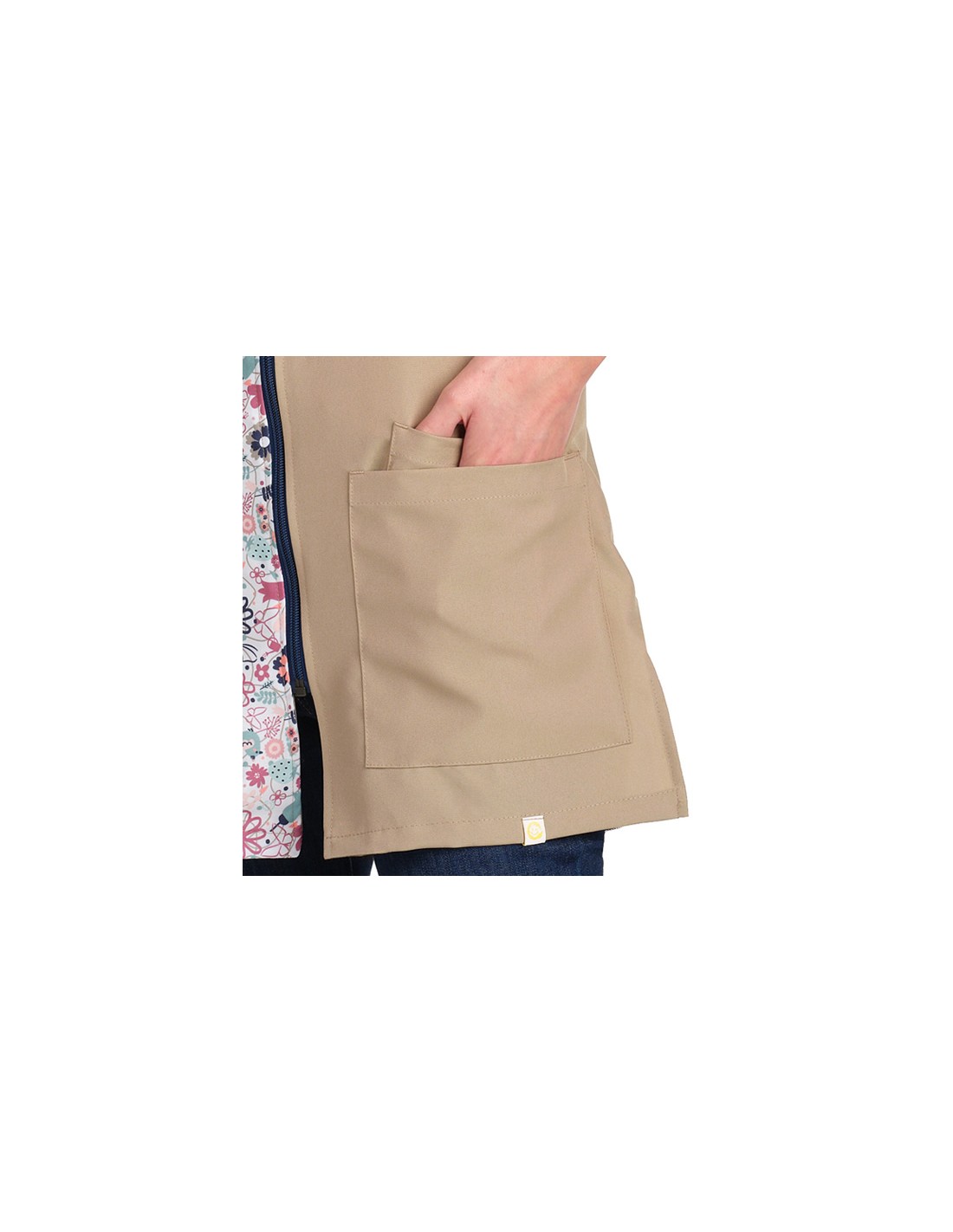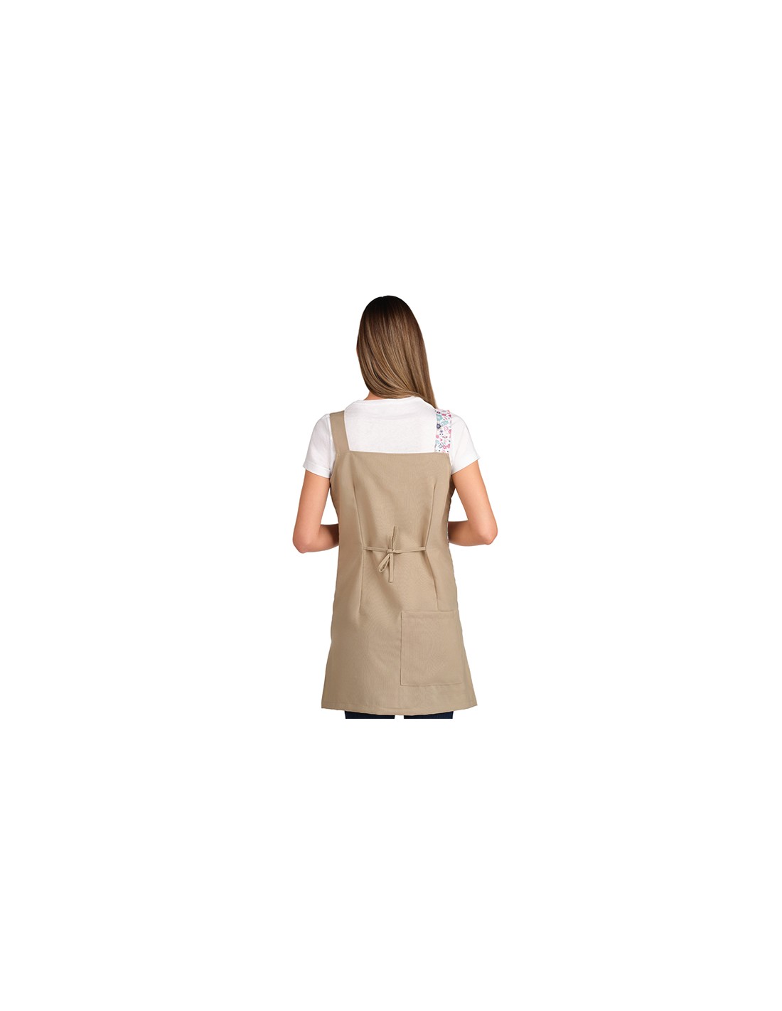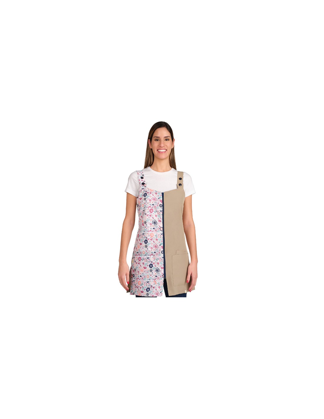 Un pichi que combina el tejido liso con un estampado floral alegre, creando una prenda fresca y femenina. Cuenta con dos bolsillos delanteros, uno de ellos con bolsillo interior y, también un cuarto en la parte trasera. Diseño con tirantes regulables mediante botones que permiten ajustarlo cómodamente. Gracias a las tiras traseras y a las aberturas laterales, la prenda se adapta fácilmente a diferentes siluetas y facilita la libertad de movimiento durante toda la jornada.