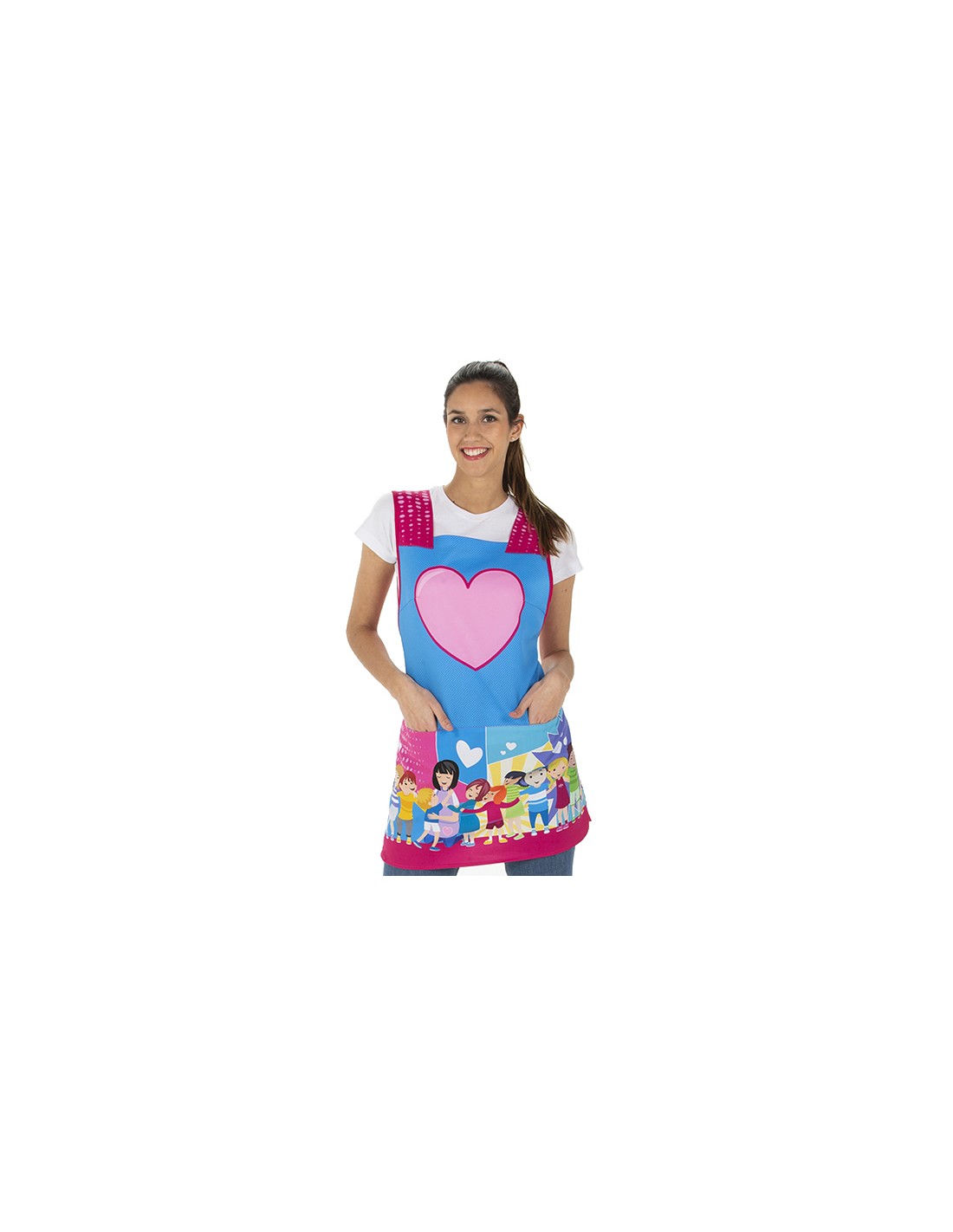 Bonita estola para profesora color fucsia y azul combinada con estampado de dibujos infantiles con niños y corazón en el peto. Dos bolsillos delanteros. El corazón tiene espacio para la personalización (si quieres). Multi talla ajustable con cintas (XS a la XL).