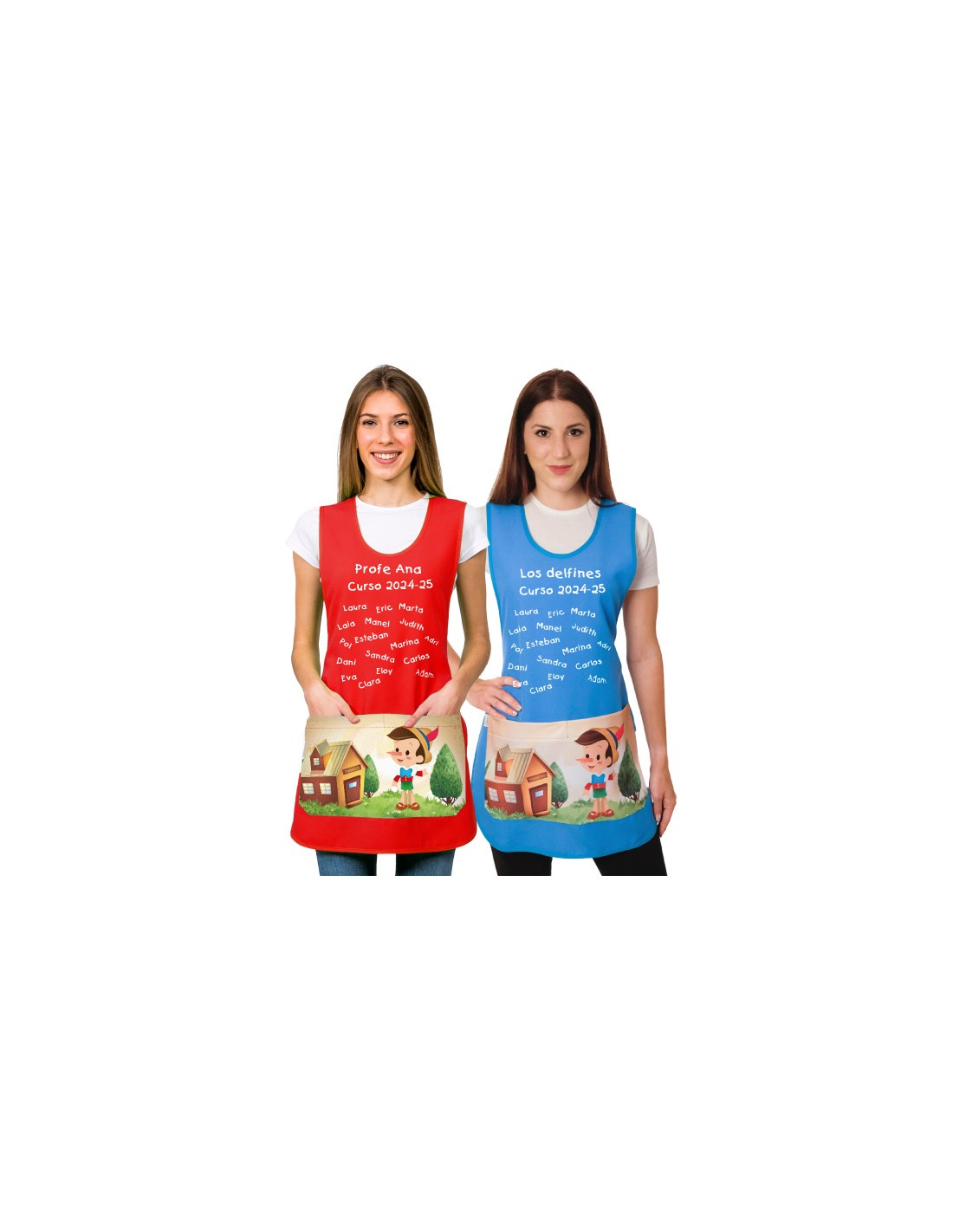 Única y exclusiva estola para maestra con estampado en bolsillo de niño de madera sobre paisaje. Cuello redondo. Gran bolsillo delantero central divisorio. Confeccionada con tejido 100% POLIÉSTER transpirable. Talla única. Multitalla. Regulable mediante cintas desde una talla XS a una talla XXL.