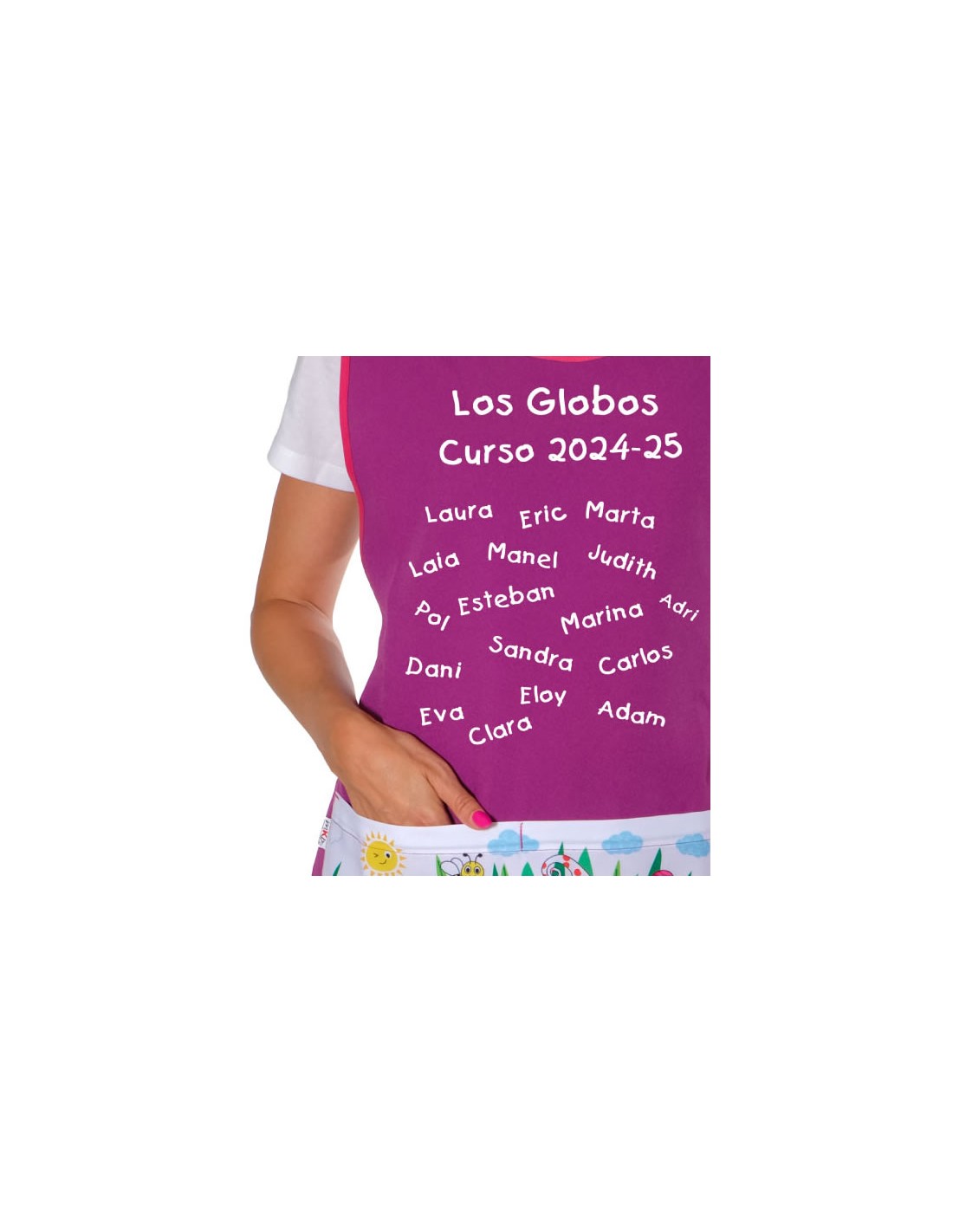 ÚNICA Y EXCLUSIVA estola para maestra de color morado con estampado de graciosos duendes en bolsillo. Bies de color fucsia a contraste. Un bolsillo central delantero divisorio con dos bolsillitos mas pequeño en su interior para los objetos más pequeños. Composición 100% Poliéster, tejido transpirable, de fácil lavado y rápido secado. Multi talla ajustable con cintas y se adapta al cuerpo desde la XS a la talla XXL).