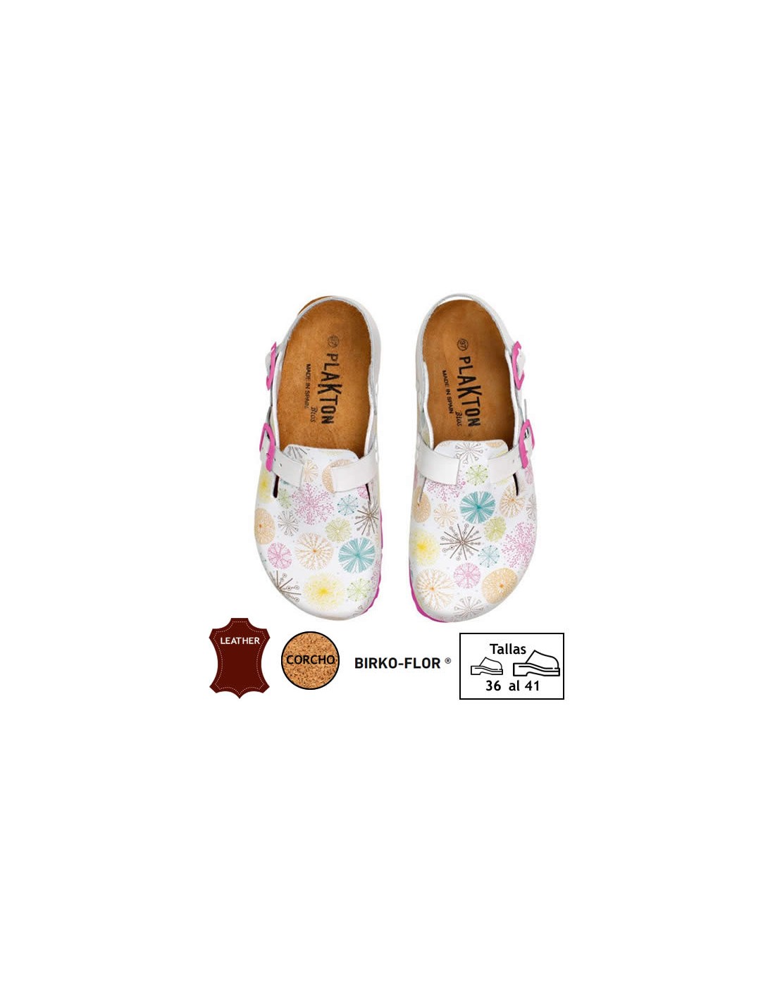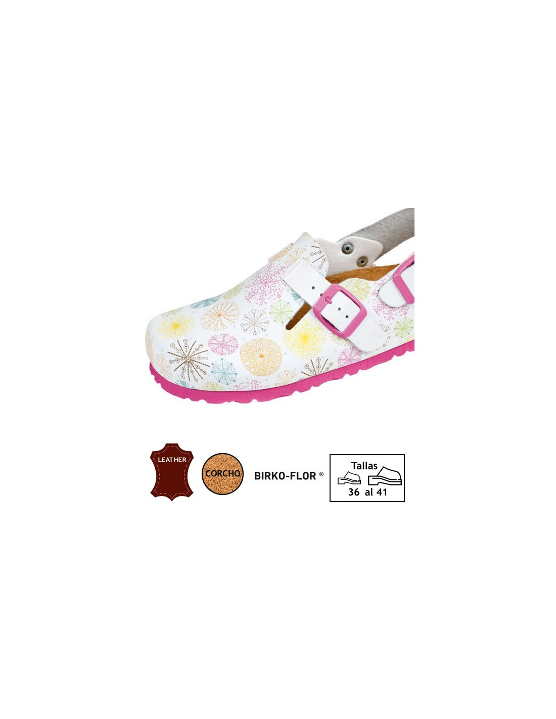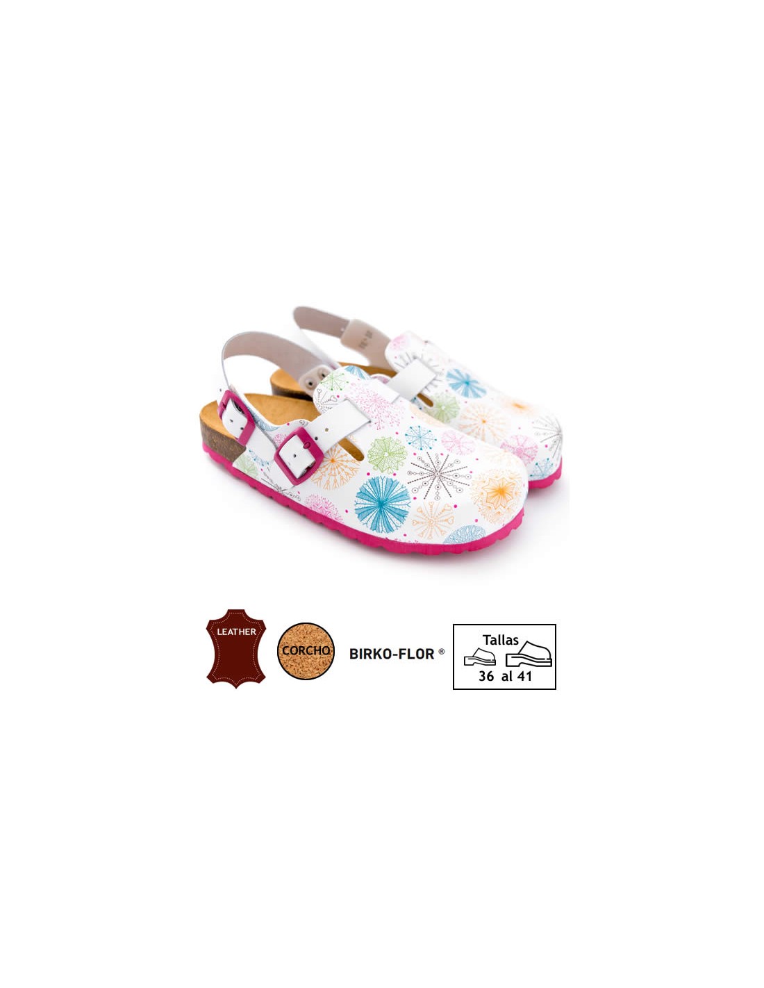 Zoccolo unisex anatomico con stampa di fuochi d'artificio. Pianta di sughero naturale rivestita in pelle. Collo del piede regolabile e cinturino sul tallone che si adatta a tutti i tipi di piedi. Molto leggero e confortevole. Disponibile dalla taglia 36 alla 41.