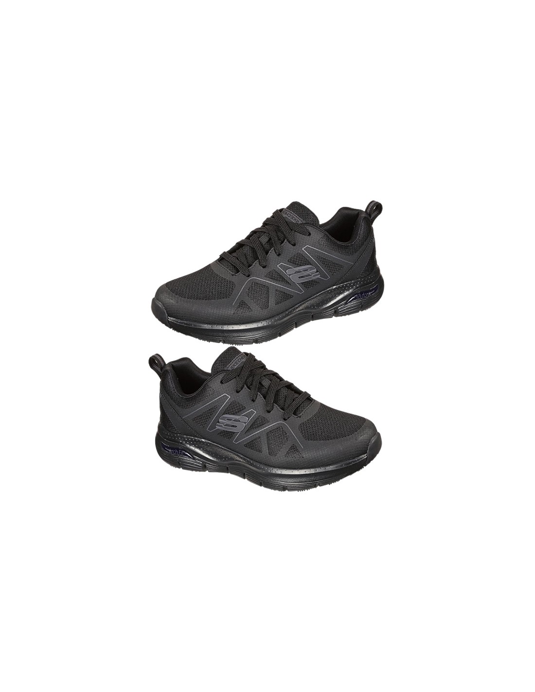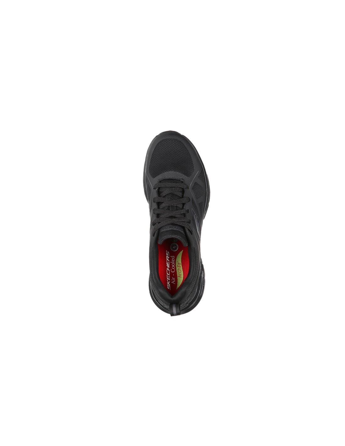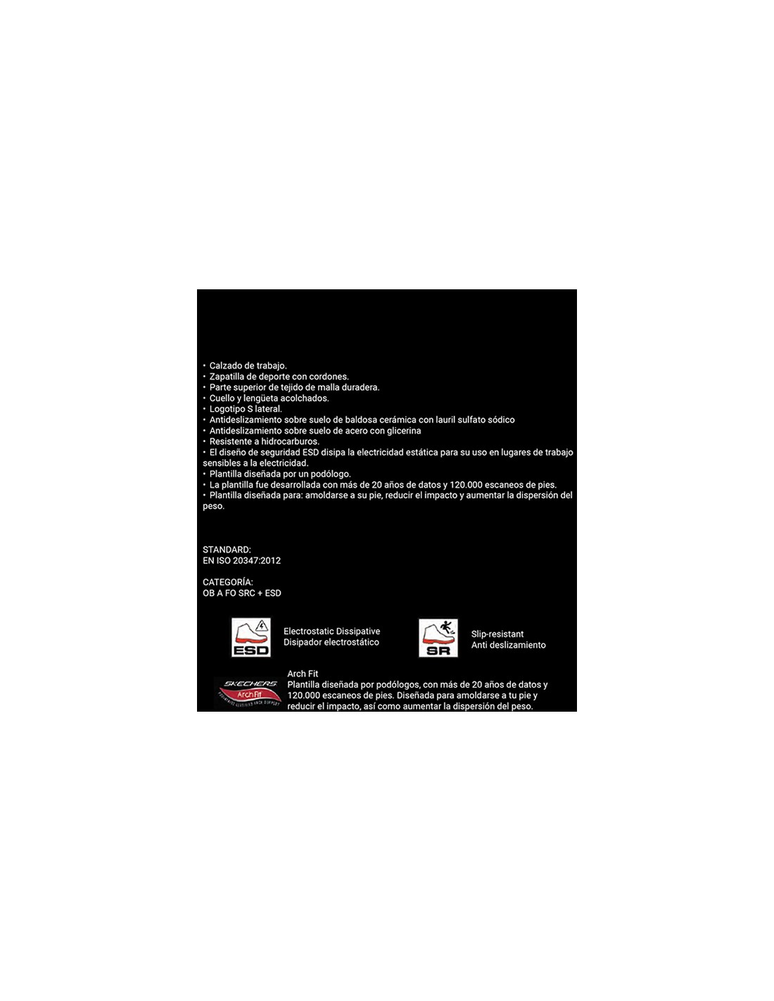 Scarpa da lavoro sportiva stringata SKECHERS. Suola antiscivolo SRC testata su piastrelle e acciaio, resistente agli idrocarburi. Tomaia in resistente tessuto a rete. Colletto e linguetta imbottiti. Soletta Arch Fit rimovibile che si adatta al piede per ridurre l'impatto e aumentare la distribuzione del peso. Disponibile in nero dalla taglia 40 alla 47,5.