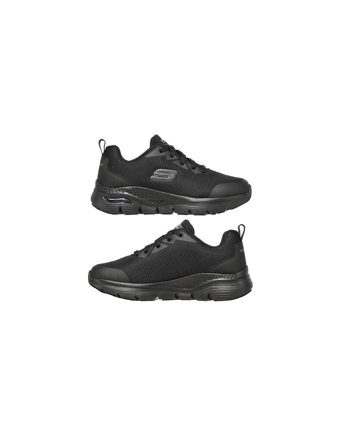 Scarpa da lavoro sportiva SKECHERS con suola antiscivolo testata SRC in piastrelle e acciaio, resistente agli idrocarburi. Chiusura con lacci con occhielli rinforzati. Sovrapposizioni sintetiche lisce su punta, tallone e lacci. Colletto e linguetta imbottiti. Morbida fodera in tessuto con soletta Arch Fit rimovibile che si adatta al piede per ridurre l'impatto e aumentare la distribuzione del peso. Disponibile in nero dalla taglia 35 alla 41.