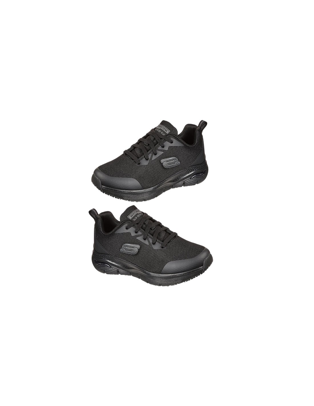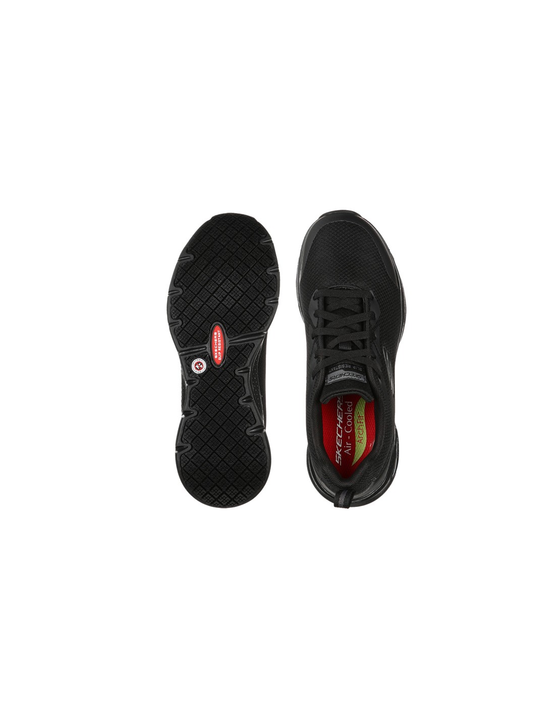 Scarpe da lavoro sportive SKECHERS con lacci e suola antiscivolo Livello SRC testato su piastrelle di ceramica con sodio lauril solfato e su pavimento in acciaio con glicerina. Resistente agli idrocarburi.
