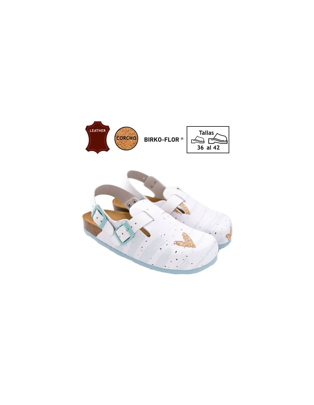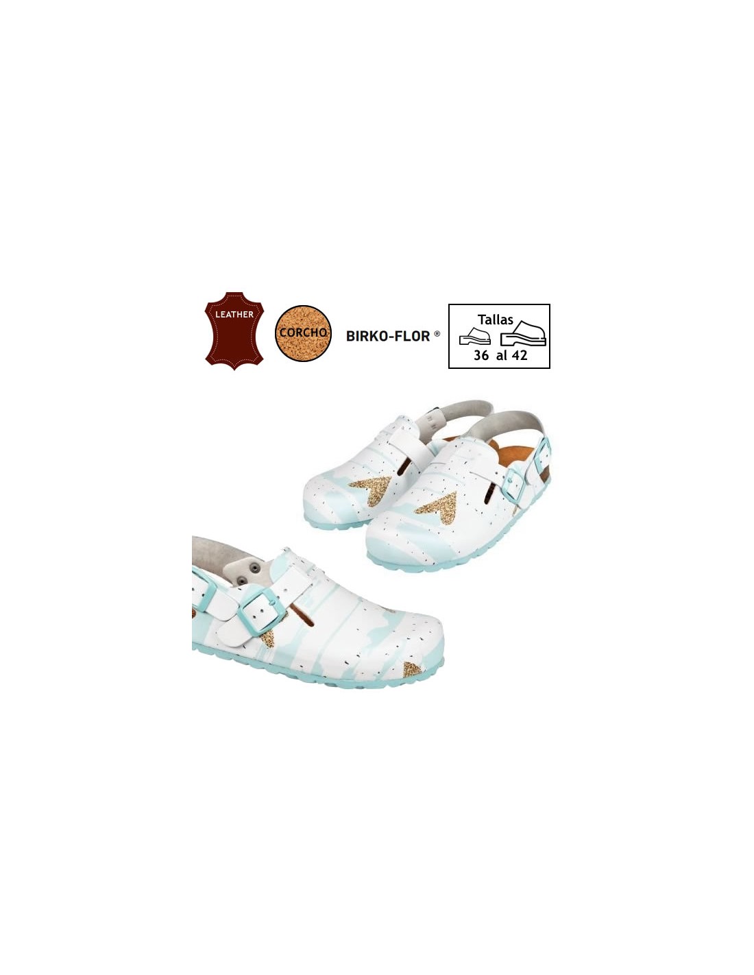 Zoccolo anatomico. Unisex. Con stampa di un cuore luccicante. Molto leggero e confortevole. Pianta di sughero naturale rivestita in pelle. Collo del piede regolabile e cinturino sul tallone che si adatta a tutti i tipi di piedi. Molto comodo e leggero