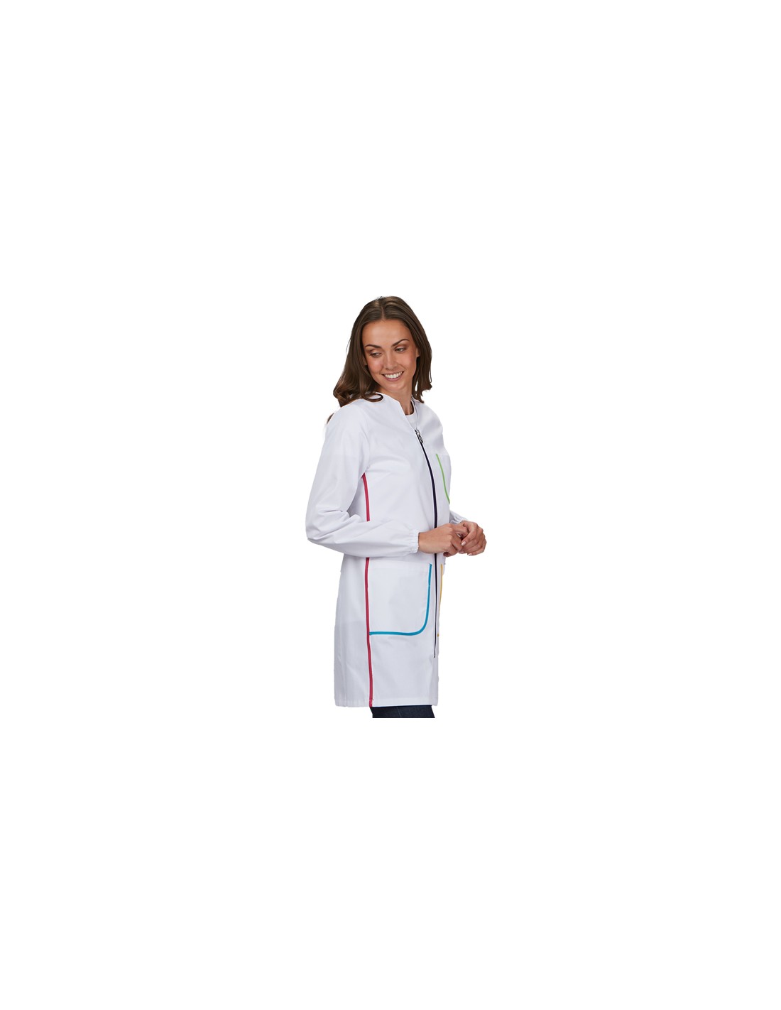 Camice maestra bianca con sfumature colorate. Scollo a V, chiusura con zip e 2 tasche frontali. Polsini elasticizzati. 35% cotone-65% poliestere. Disponibile dalla XS alla XXL.