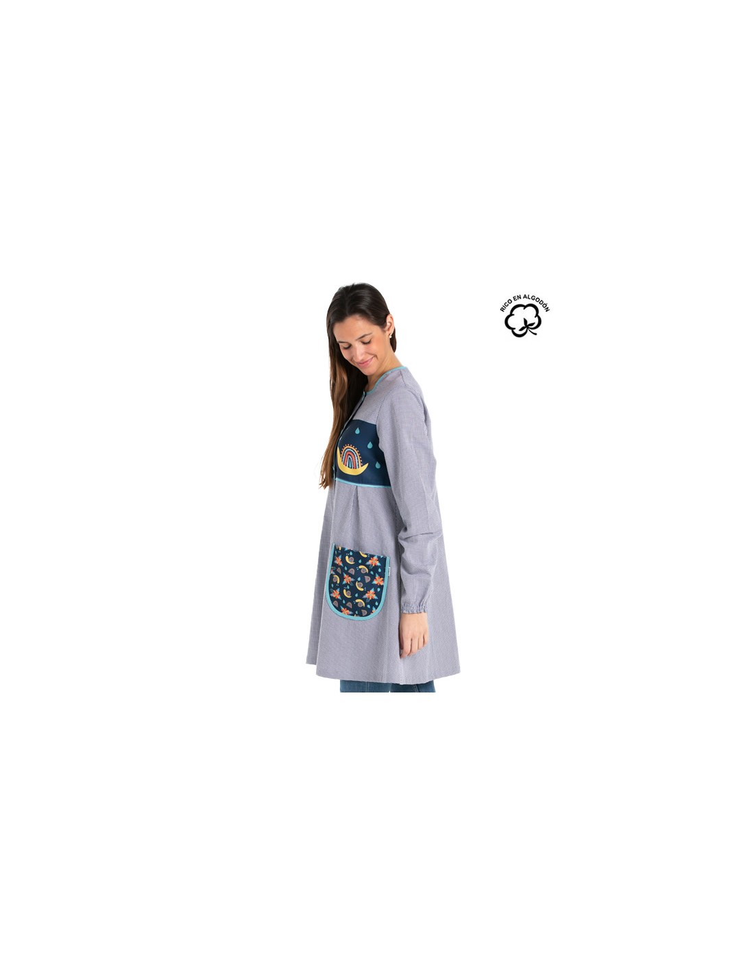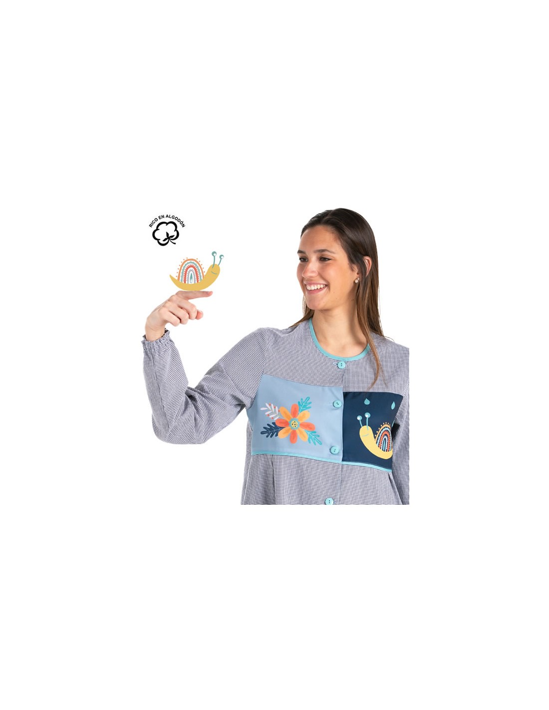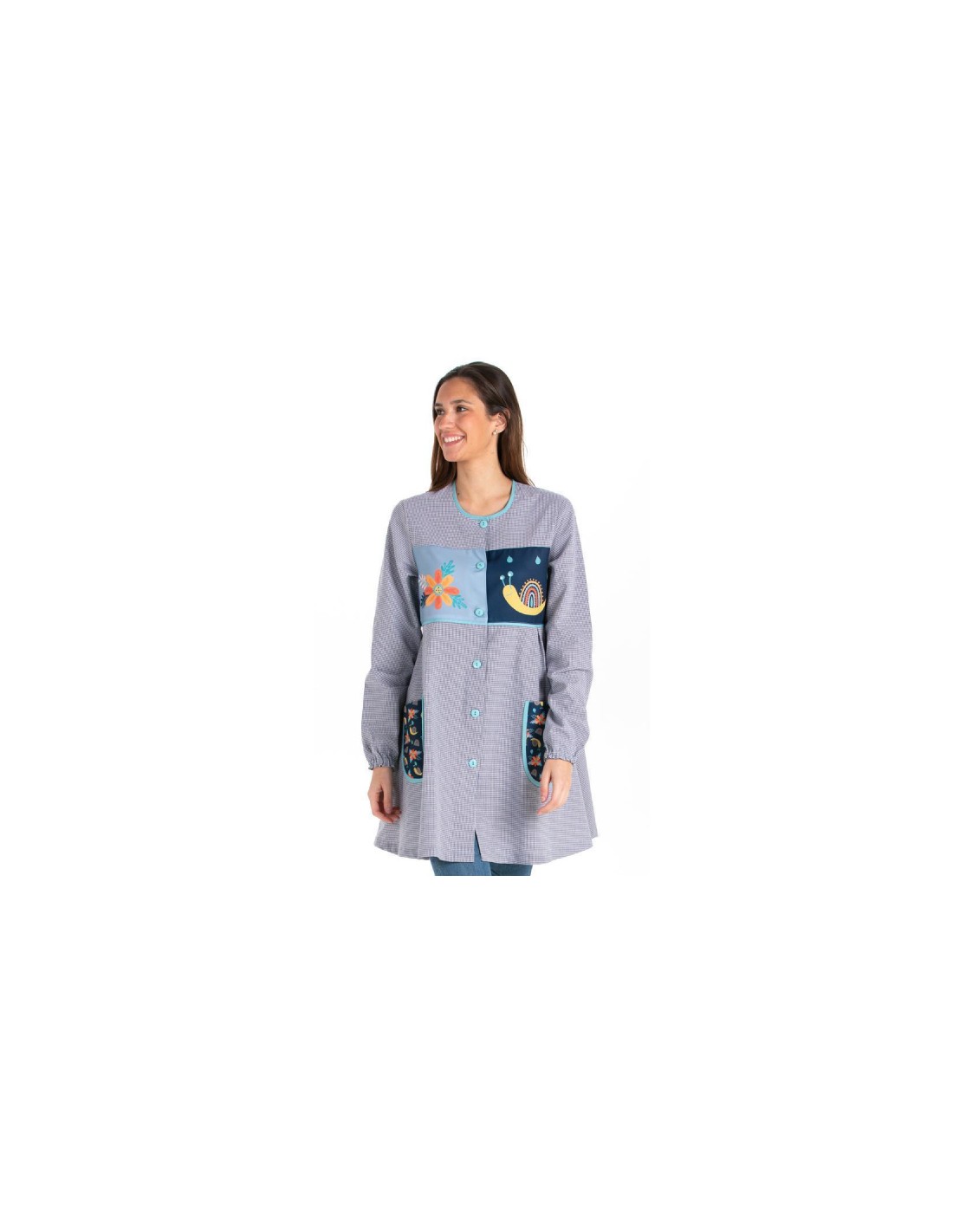 Camice da insegnante dal taglio svasato realizzato in tessuto vichy blu navy con stampa di lumache e fiori sul carré e sulle tasche. Maniche lunghe con polsini elastici. Due grandi tasche. Chiusura con bottoni. Girocollo. Lunghezza approssimativa 87 cm. Disponibile dalla taglia XS alla taglia 3XL