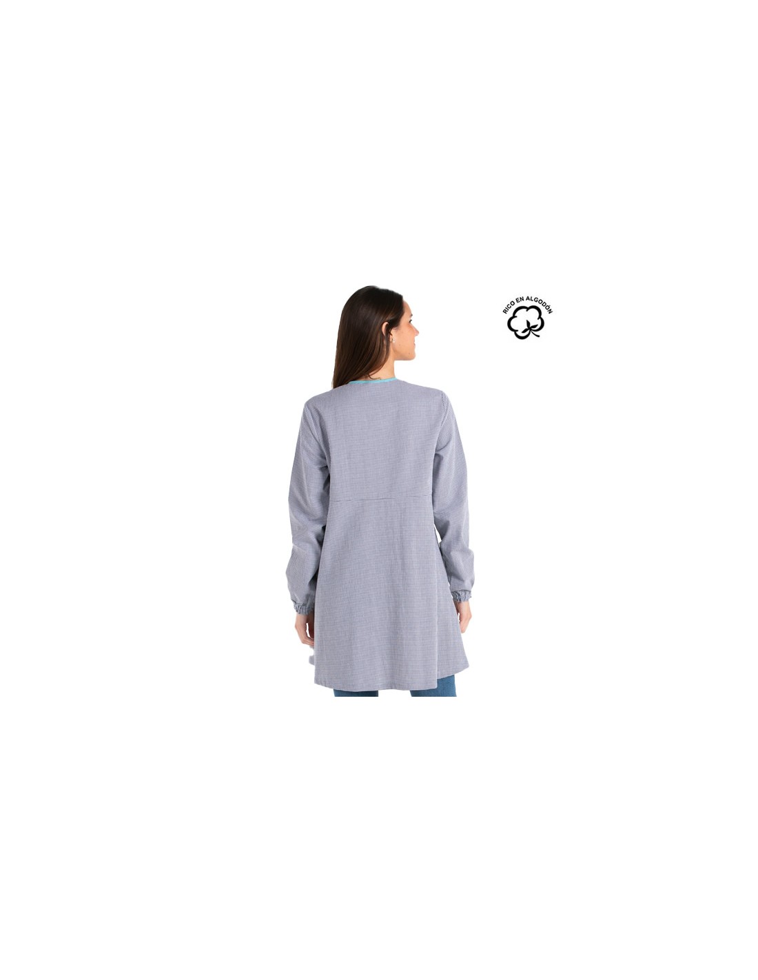 Camice da insegnante realizzato in tessuto vichy blu navy. Manica lunga con polsini elastici. Taglio svasato. Due grandi tasche. Girocollo. Chiusura con bottoni azzurri