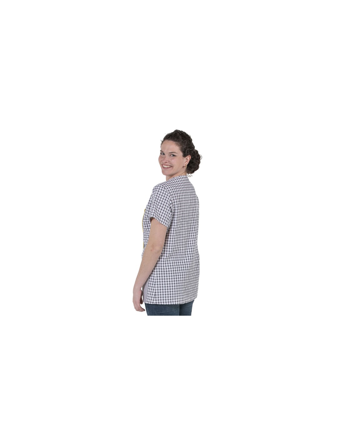 Camice da insegnante a maniche corte realizzata in tessuto a quadretti grigio. Divertente stampa zebrata sul lato anteriore destro. Chiusura asimmetrica con bottoni gialli a contrasto e fettuccia in sbieco.
