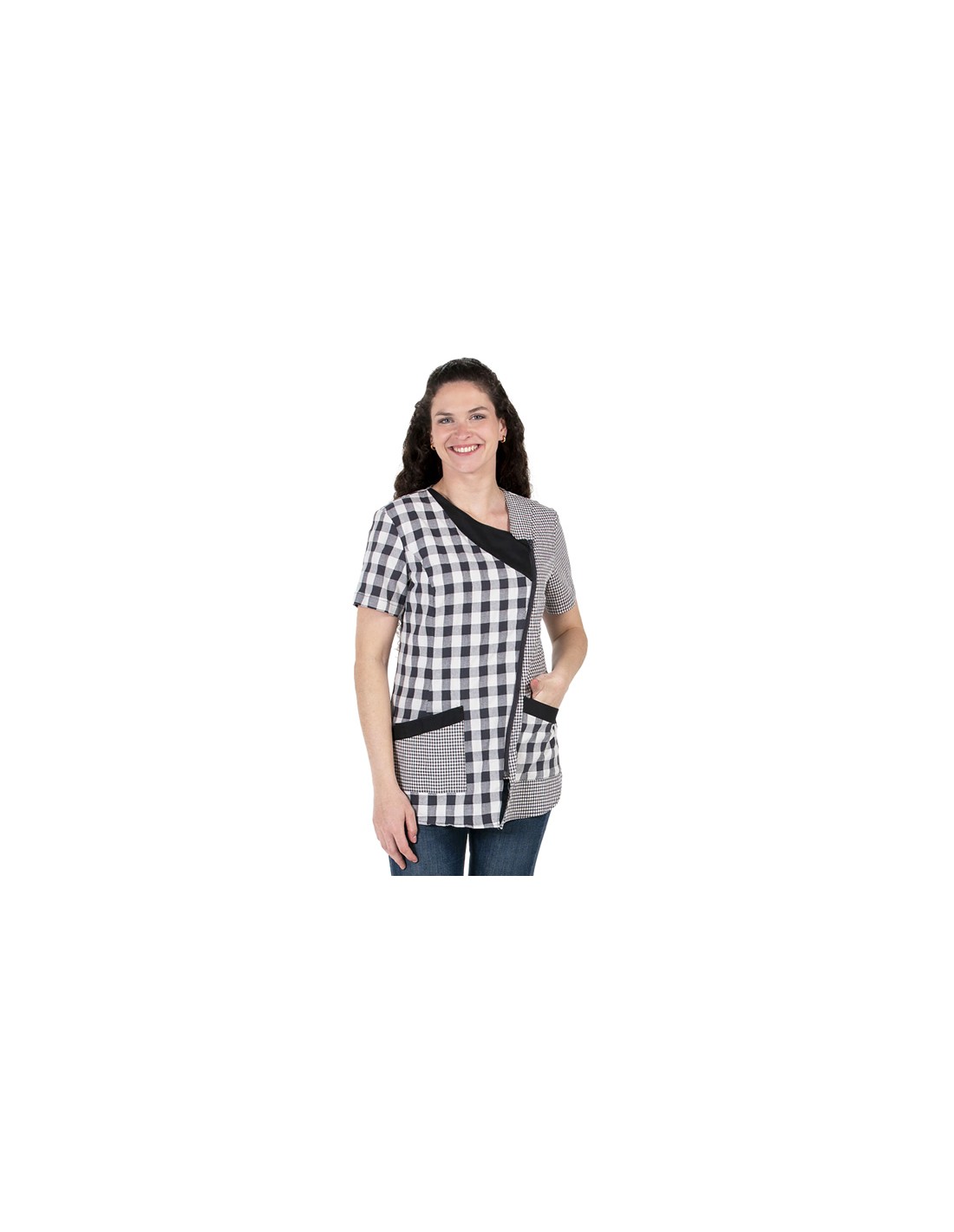 Camice da insegnante a maniche corte realizzato in tessuto a quadretti grigio antracite in una combinazione di taglie a quadretti sulla tasca e sul fianco. Chiusura con cerniera asimmetrica. Due tasche. Tessuto ricco di cotone, molto morbido e confortevole. (Disponibile dalla XS alla 3XL).