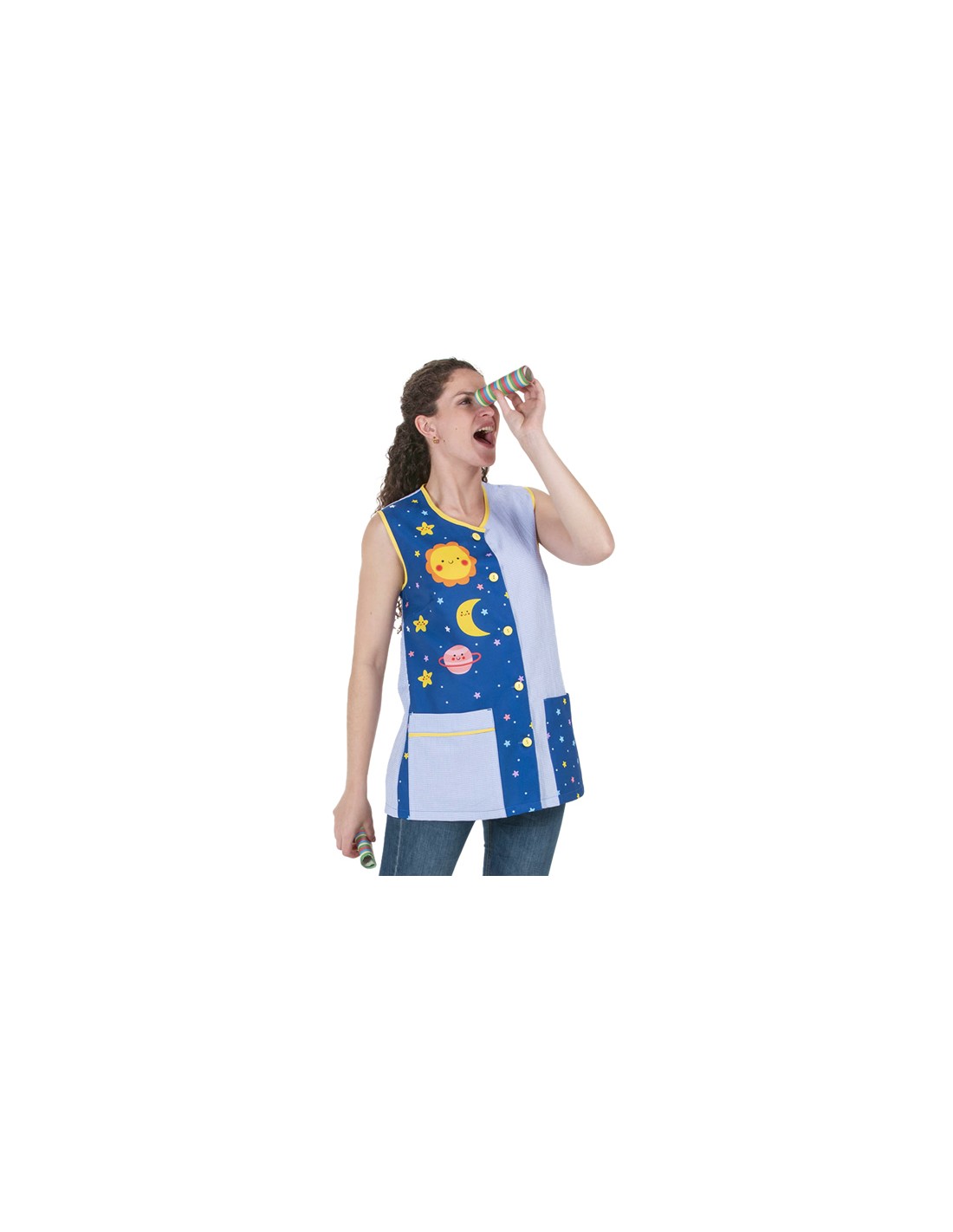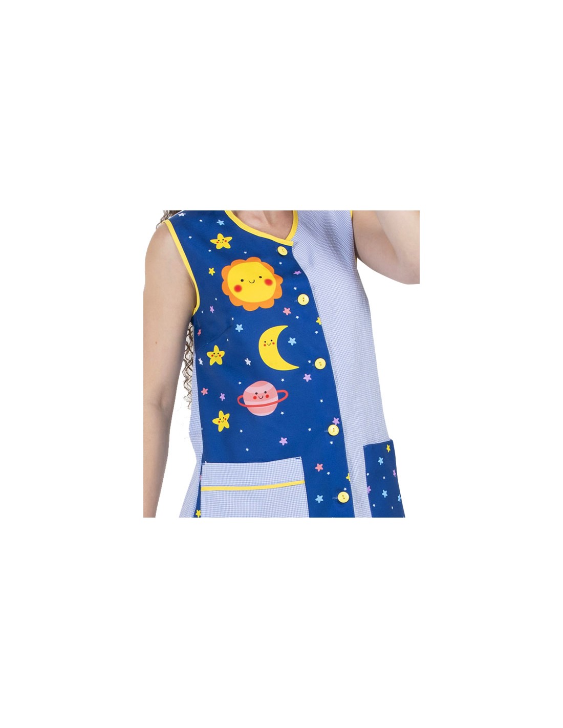 Camice da insegnante senza maniche realizzata in tessuto a quadretti blu con stampa frontale di pianeti e stelle. Chiusura con bottoni e sbieco gialli a contrasto. Due tasche. Tessuto ricco di cotone, molto morbido e confortevole. (Disponibile dalla XS alla 3XL).