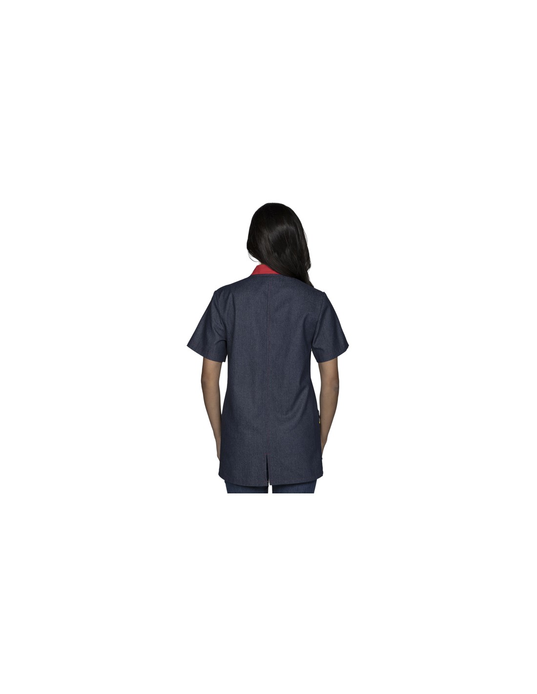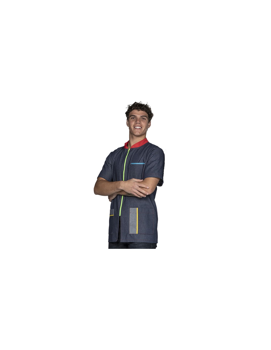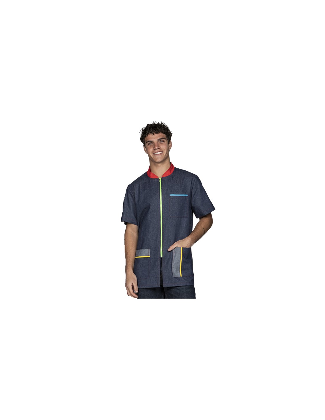 Camicetta unisex in denim a maniche corte con scollo rotondo rosso e cerniera centrale color pistacchio. Tre tasche: due ampie tasche sui fianchi con profili rossi e pistacchio, e una terza tasca superiore sul petto a sinistra senza profili. Uno spacco sulla parte bassa della schiena offre maggiore comfort e libertà di movimento. Tessuto molto piacevole al tatto. Disponibile nelle taglie dalla XS alla 3XL.