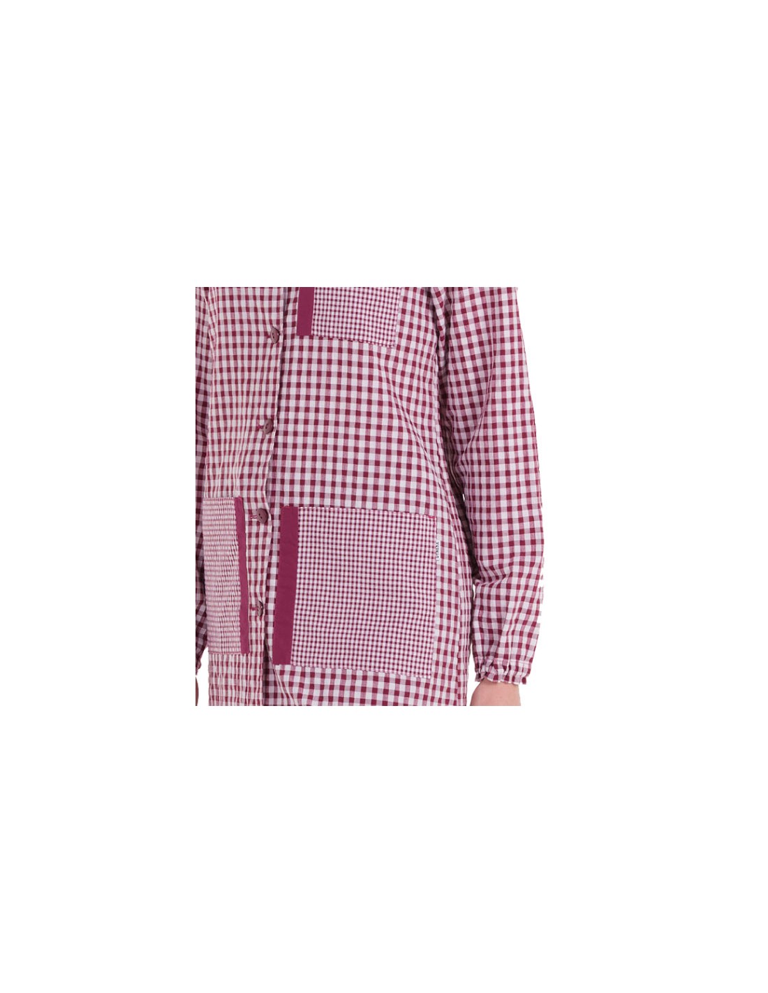 Grembiule classico di maestra vichy colore melanzana. Manica lunga, collo rendondo finito in V. Tessuto di tatto soave molto gradevole di quadri melanzana e bianco. Tre tasche, due inferiori ed un superiore. Tapetas delle tasche, bottoni e vivo nel collo dello stesso colore. Aperture nei laterali ed elastici nei pugni.