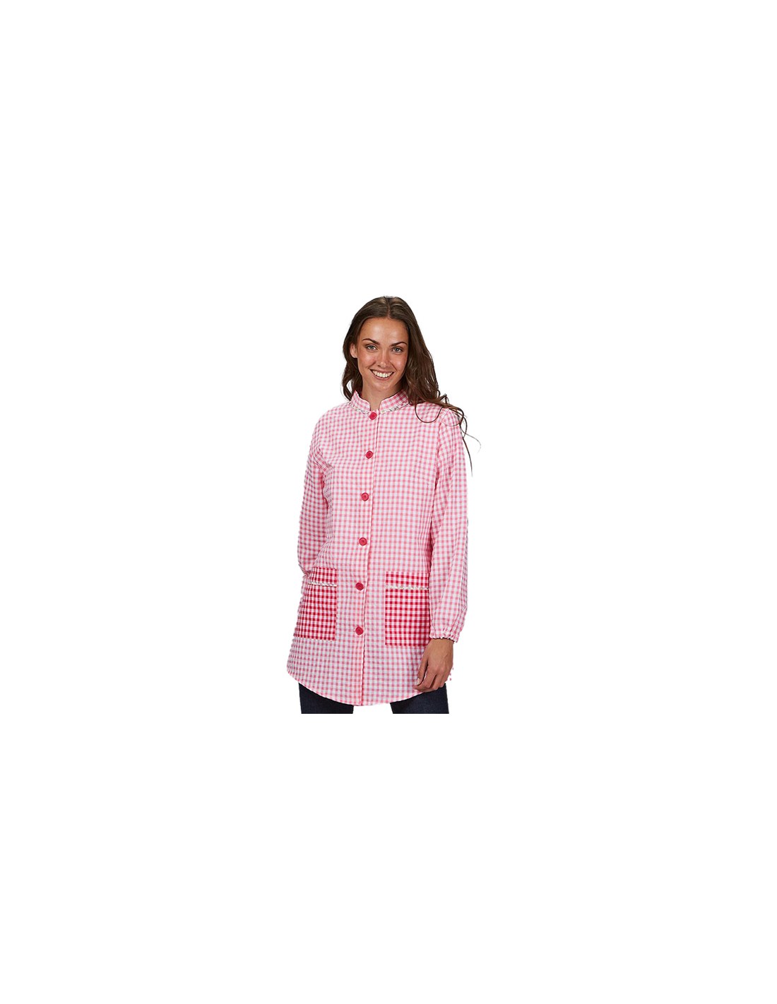 Camice maniche lunghe in tessuto vichy (150 g/m²) con una combinazione di quadri rosa e bianchi. Abbottonatura centrale con grandi bottoni fucsia in tinta con le tasche sui fianchi e il tassello posteriore. Collo alla coreana con bordo stampato abbinato al profilo delle tasche. Realizzato in 60% cotone biologico, 20% poliestere riciclato e 20% poliestere.