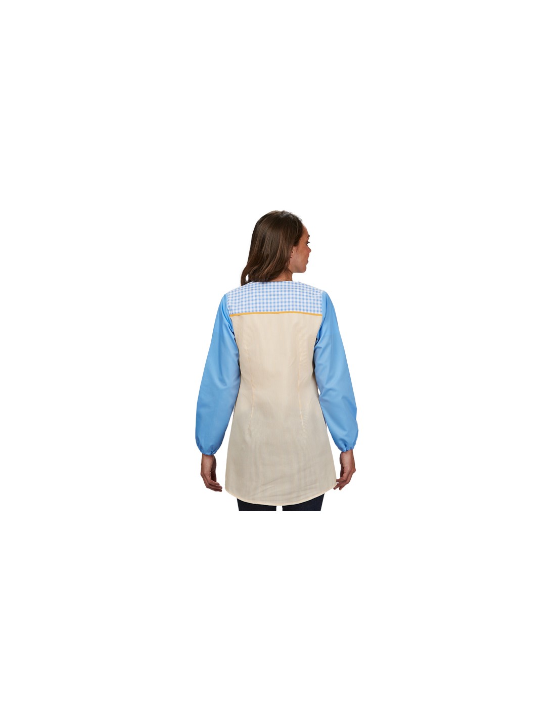 Camice a maniche lunghe realizzata in tessuto a righe gialle, con spalle a quadretti gessati celesti e maniche in poliestere celesti. Due ampie tasche celesti, quella sinistra con stampa animalier. Scollo rotondo e chiusura centrale con cerniera. Realizzata in 70% poliestere e 30% cotone, un tessuto molto confortevole, morbido e piacevole al tatto. Lunghezza approssimativa 85 cm. Disponibile nelle taglie dalla XS alla XXL.