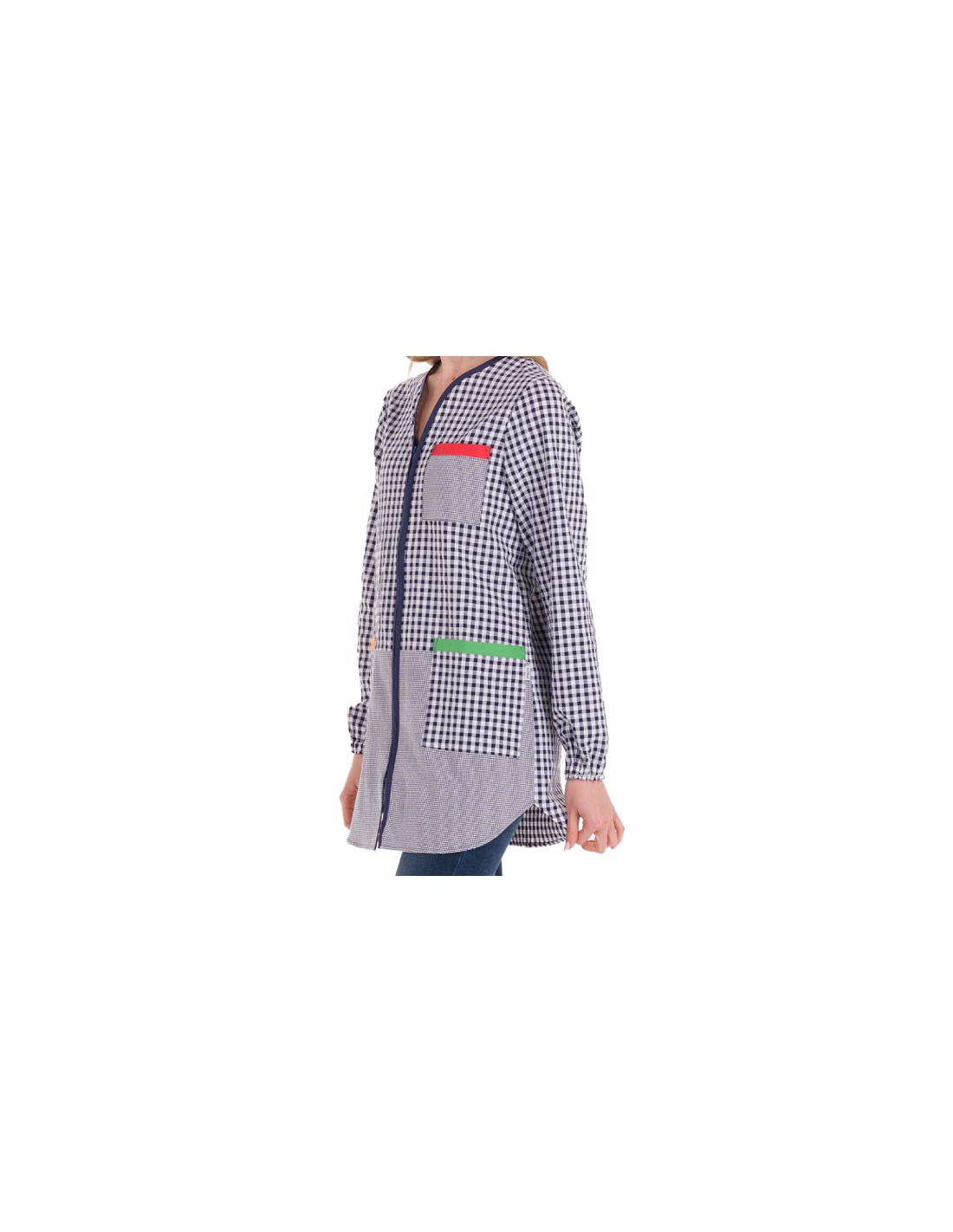 Grembiule maestra di manica lunga, tessuto vichy blu scuro combinando con quadri più piccoli nella parte inferiore. Tre tasche, due inferiori ed uno nella pettorina sinistra coi vivi di colori. Chiuda con cerniera anteriore di colore blu navy Aperture nei laterali ed elastici nei pugni. Il suo tessuto permette un facile e rapida lavaggio, essicazione e stiratura.