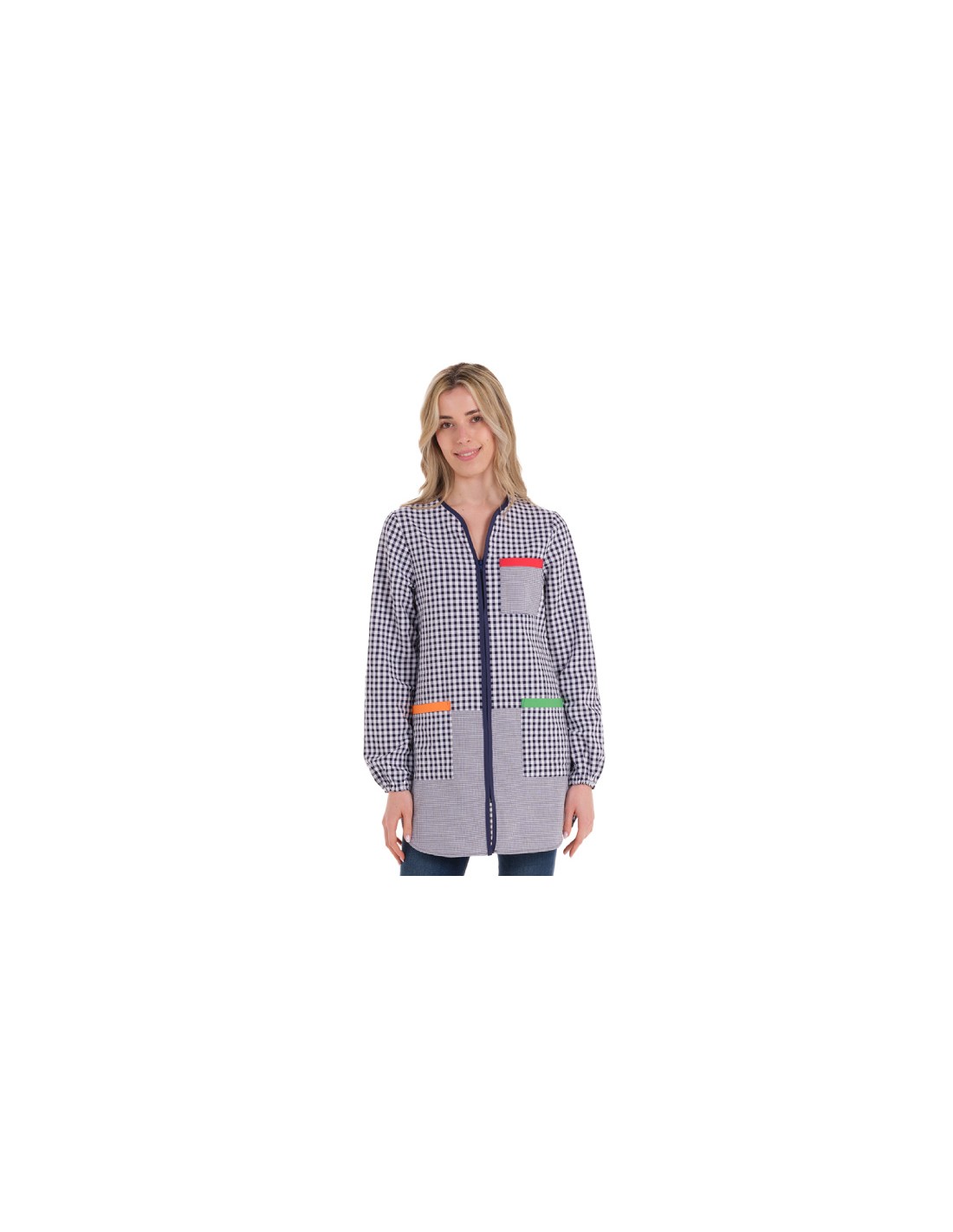 Non dimenticare di salvare la tua personalizzazione per poter riempire il carrelloBatta di maestra di manica lungo, tessuto vichy blu scuro combinando con quadri più piccoli nella parte inferiore. Tre tasche, due inferiori ed uno nella pettorina sinistra coi vivi di colori. Chiuda con cerniera anteriore di colore blu navy. Aperture nei laterali ed elastici nei pugni. Lungo: 84 cm