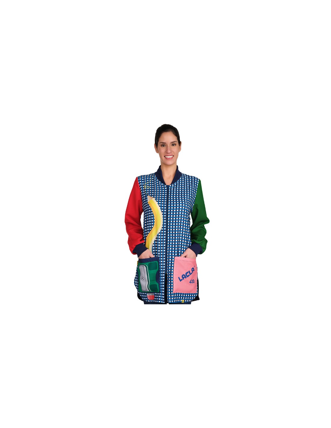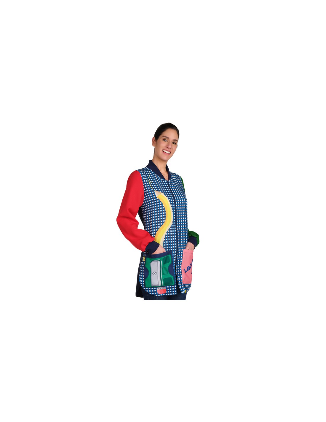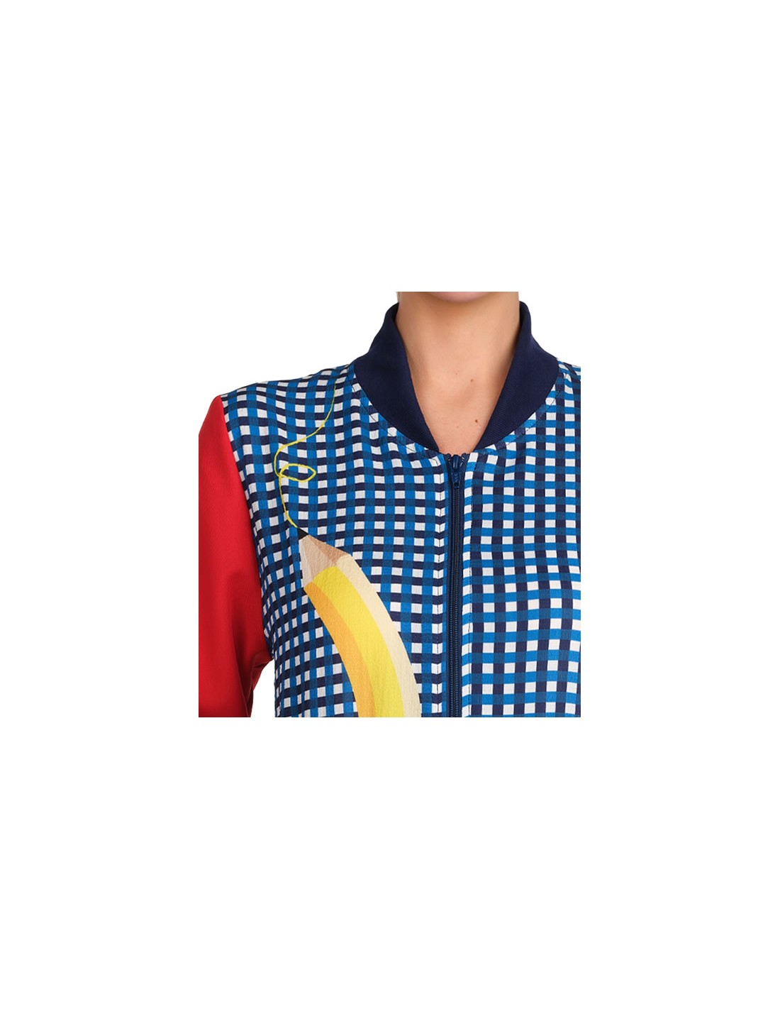 Camice da insegnante con stampa a quadri e un esclusivo design a matita sul davanti. Colletto a costine con chiusura frontale con zip. Maniche lunghe in colori a contrasto con polsini a costine. Tre tasche anteriori, di cui una interna. Pinces e lacci regolabili sul retro per un maggiore comfort. Spacchi laterali con linguette rinforzate.