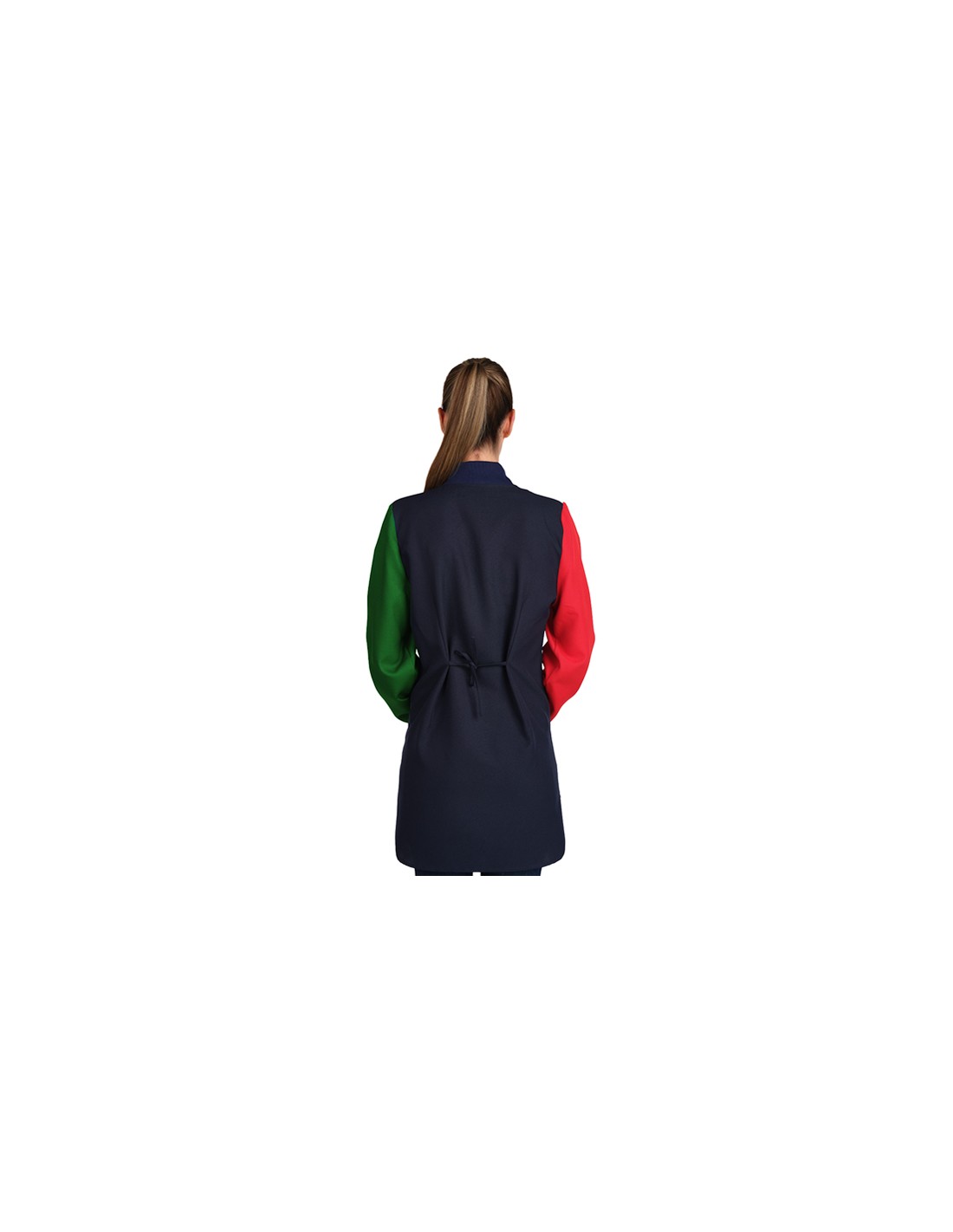 Il design combina maniche a contrasto e colletto a costine. Presenta tre tasche funzionali, una delle quali è una tasca interna per piccoli oggetti. La chiusura con zip consente di indossare e togliere il camice in modo rapido e semplice, una caratteristica pratica per la vita scolastica di tutti i giorni. Il retro presenta pinces e lacci regolabili per garantire una vestibilità comoda a diverse corporature e consentire una maggiore libertà di movimento.