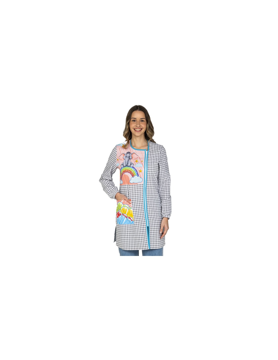Camice lungo da insegnante in tessuto a quadretti grigi con pannello frontale a stampa arcobaleno con elefanti e tasca coordinata. Presenta chiusura frontale con zip turchese, pinces posteriori per una vestibilità sartoriale e piccoli spacchi laterali per maggiore comfort e libertà di movimento. Disponibile nelle taglie dalla XS alla 3XL. Lunghezza: 84 cm.
