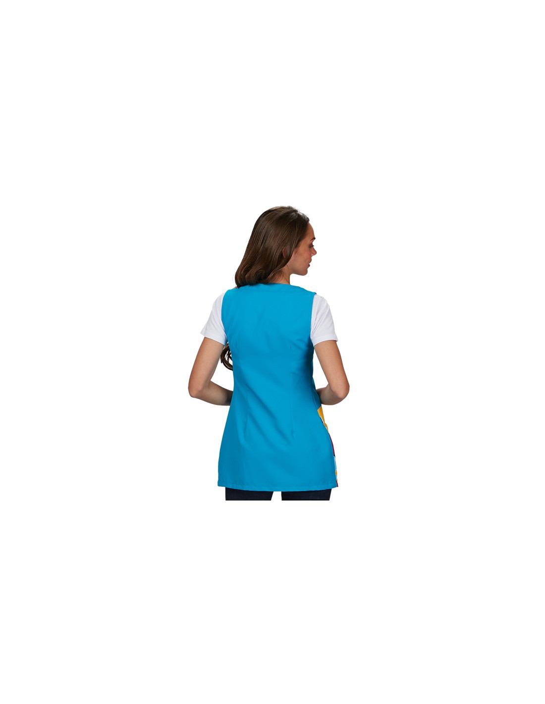 Camice senza maniche per insegnanti blu turchese combinato con pezzi di puzzle colorati stampati sull'unica tasca destra. Collo quadrato. Freccette sul petto e sulla schiena. Chiusura con doppia zip lato carrello. Lunghezza ca. 75 centimetri. Disponibile dalla taglia XS alla XXL