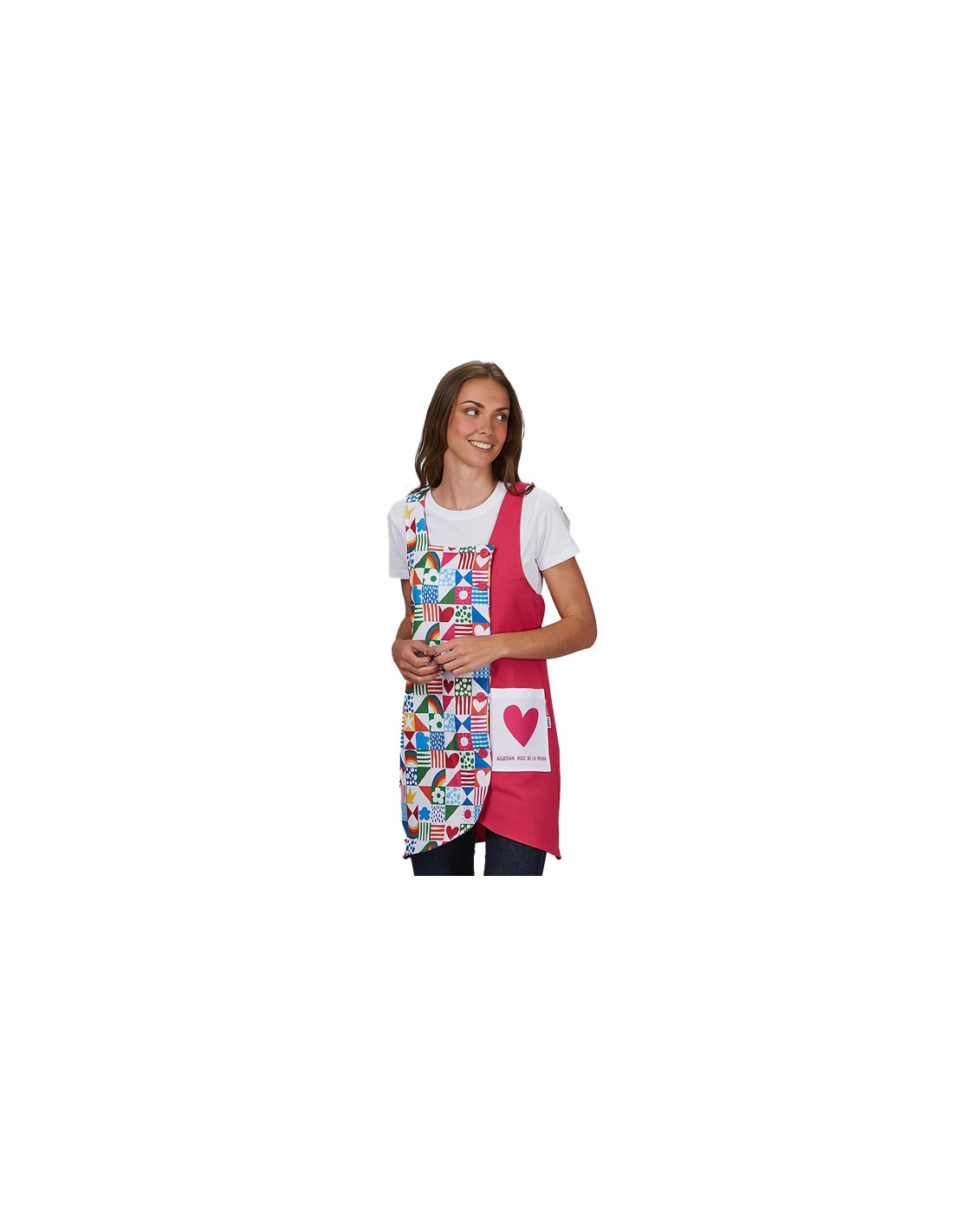 Vestito da insegnante fucsia con stampa disegno Agatha Ruiz de la Prada. Chiusura con bottoni asimmetrici. Scollo quadrato e spalline incrociate sul retro. Una tasca sul lato sinistro. Pinces sul petto, elastici laterali e cinghie posteriori per una migliore vestibilità.