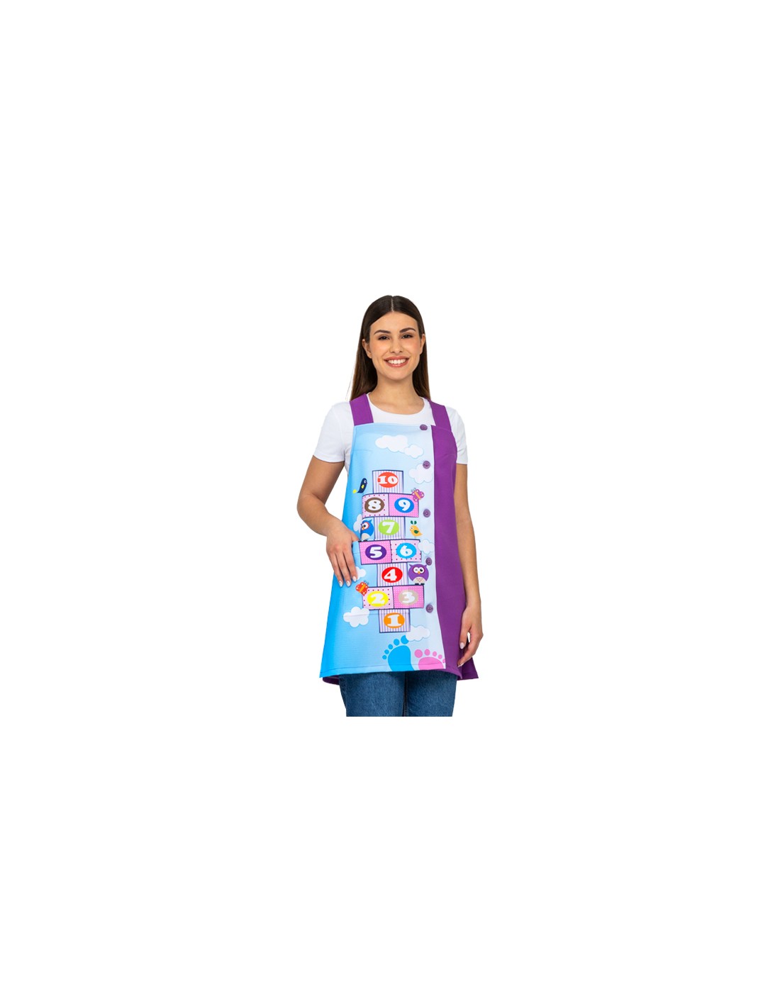 Vestito da insegnante viola con stampa di campana sul lato destro. Chiusura con bottoni. Bretelle incrociate e tassello sul retro per più spazio. Una tasca sul lato destro e un'altra sul retro. Realizzato con tessuto 100% POLIESTERE traspirante, facile da lavare e asciugare. Non necessita di stiratura. (Disponibile dalla S alla XXL).
