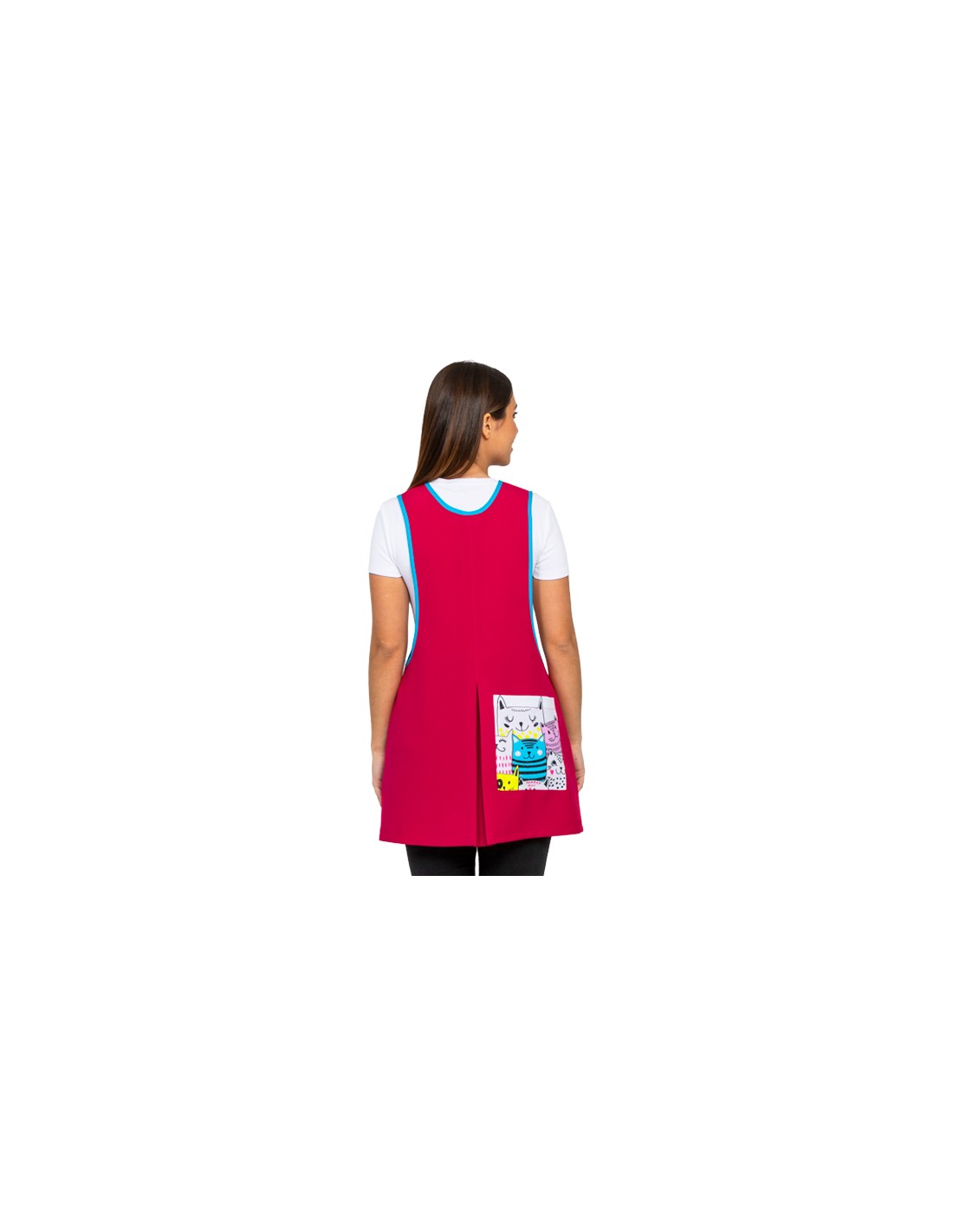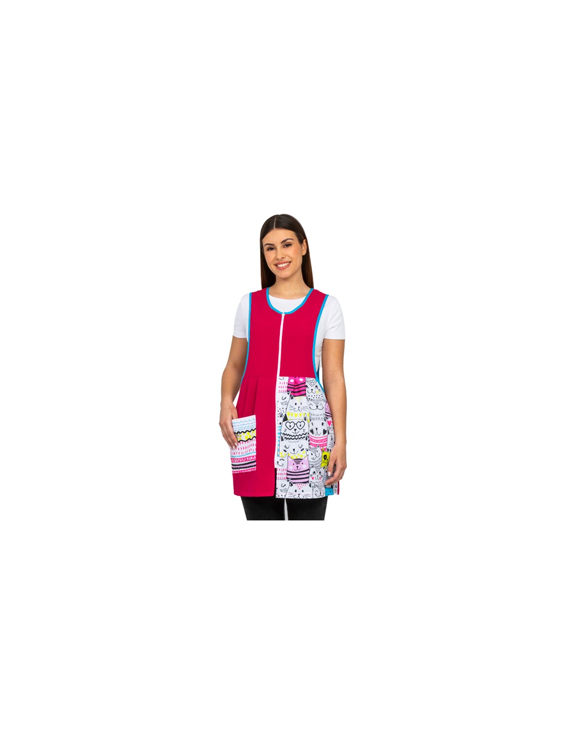 Vestito fucsia da maestra con parte inferiore sinistra stampata con divertenti gattini. Collo e maniche in sbieco blu a contrasto. Chiusura con cerniera centrale bianca. Una tasca anteriore destra e una tasca posteriore. Bretelle e tassello sul retro. Composizione: 100% Poliestere (Disponibile dalla S alla XXL). Tessuto morbido, traspirante e antibatterico. Asciugatura rapida, non è necessaria la stiratura.