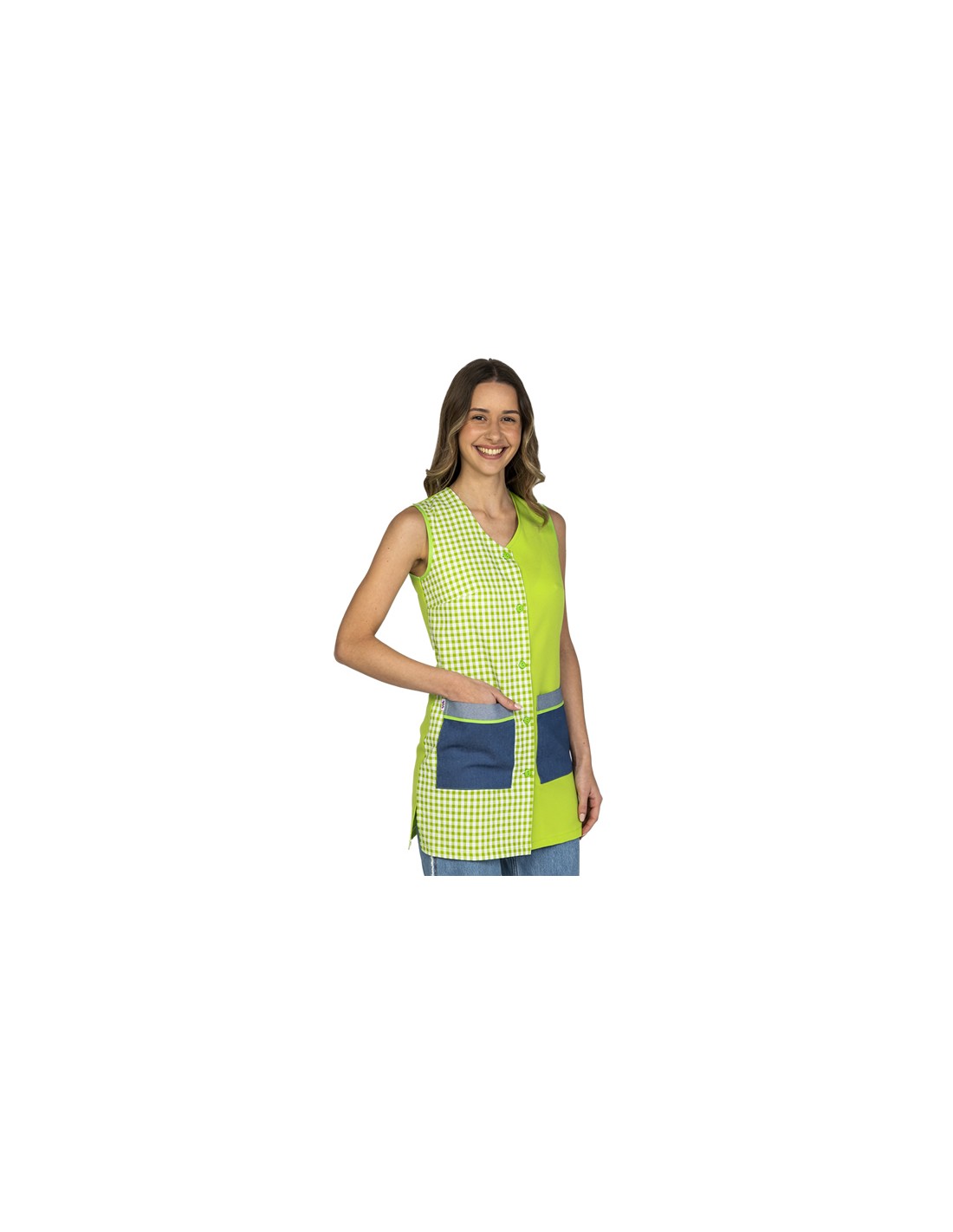 Vestaglia verde senza maniche abbinata a tessuto Vichy. Due tasche frontali in stile denim che uniscono stile e funzionalità. Chiusura con bottoni e laccetto posteriore per una migliore vestibilità. Realizzato in 100% poliestere, facile da lavare e asciugare. Taglie dalla S alla 3XL. Lunghezza: 84 cm.