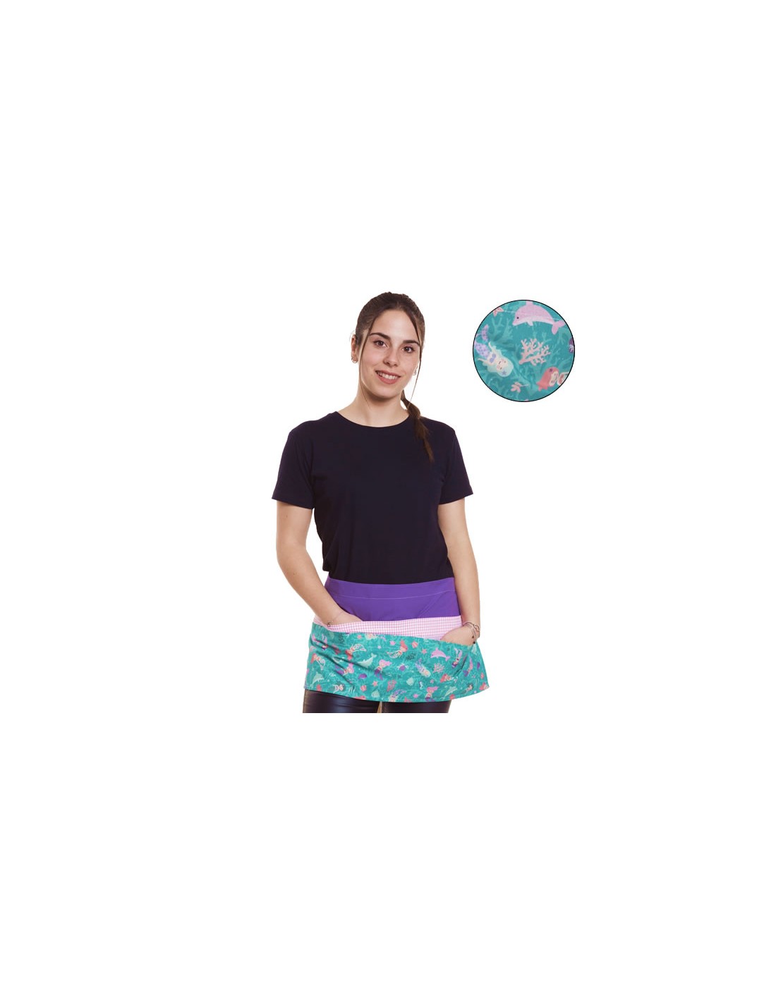 Grembiule organizzativo viola per insegnanti con stampa di sirene. Grembiule corto con sei tasche, regolabile con nastri, allacciabile dietro, davanti o lateralmente. Multidimensione regolabile. Tessuto morbido e delicato sulla pelle.