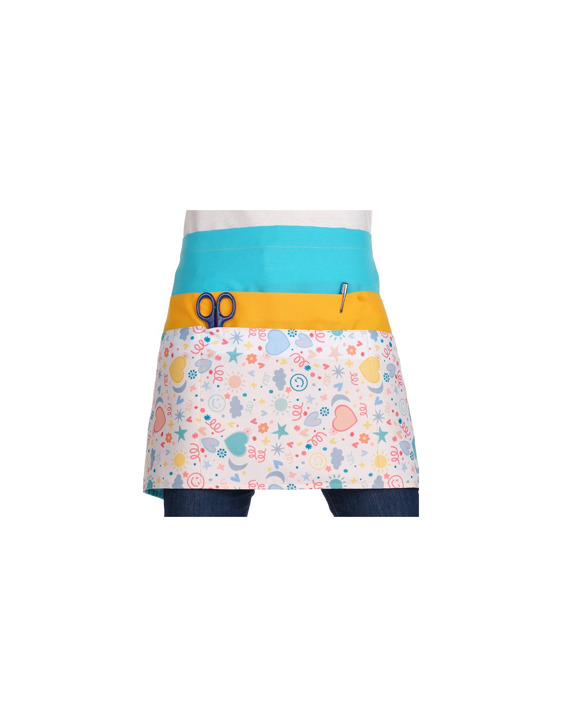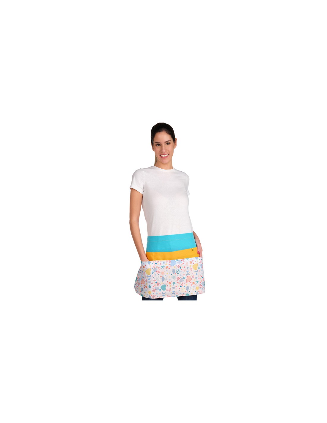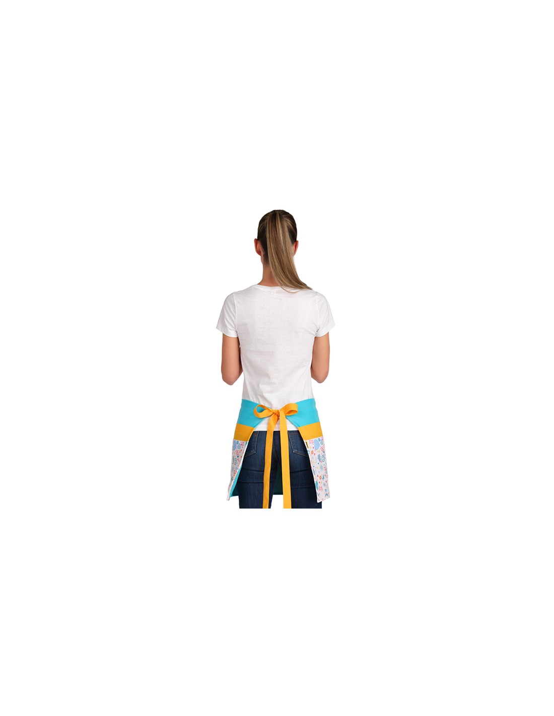 Grembiule corto unisex con una divertente stampa che combina giallo, turchese e rosa. Dotato di sei tasche frontali con passanti rinforzati. Regolabile con lacci laterali e passanti rinforzati. Taglia unica. Dimensioni approssimative: 38 x 77 cm. Composizione: 100% poliestere.