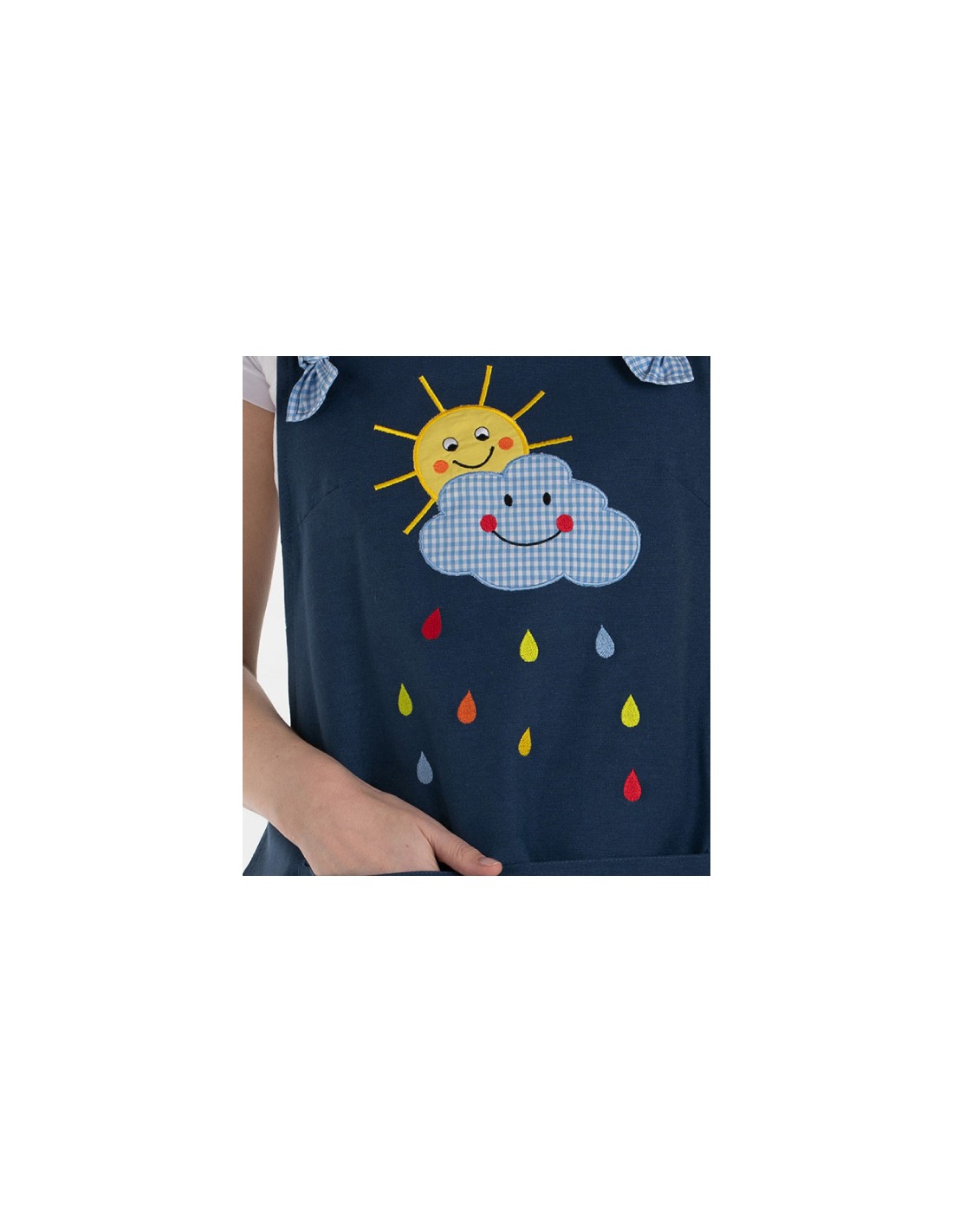 Non dimenticare di salvare la tua personalizzazione per poter riempire il carrelloStola per insegnante con un disegno di sole e nuvola ricamati nel corpetto sorridendo con gocce di pioggia di colori. Il tessuto è colore blu. Si allaccia con fattorini nei laterali. I tiranti sono regolabili a gioco con la nuvola ricamata. Ha una tasca anteriore con fiori ricamati. Molto: 78 cms.
