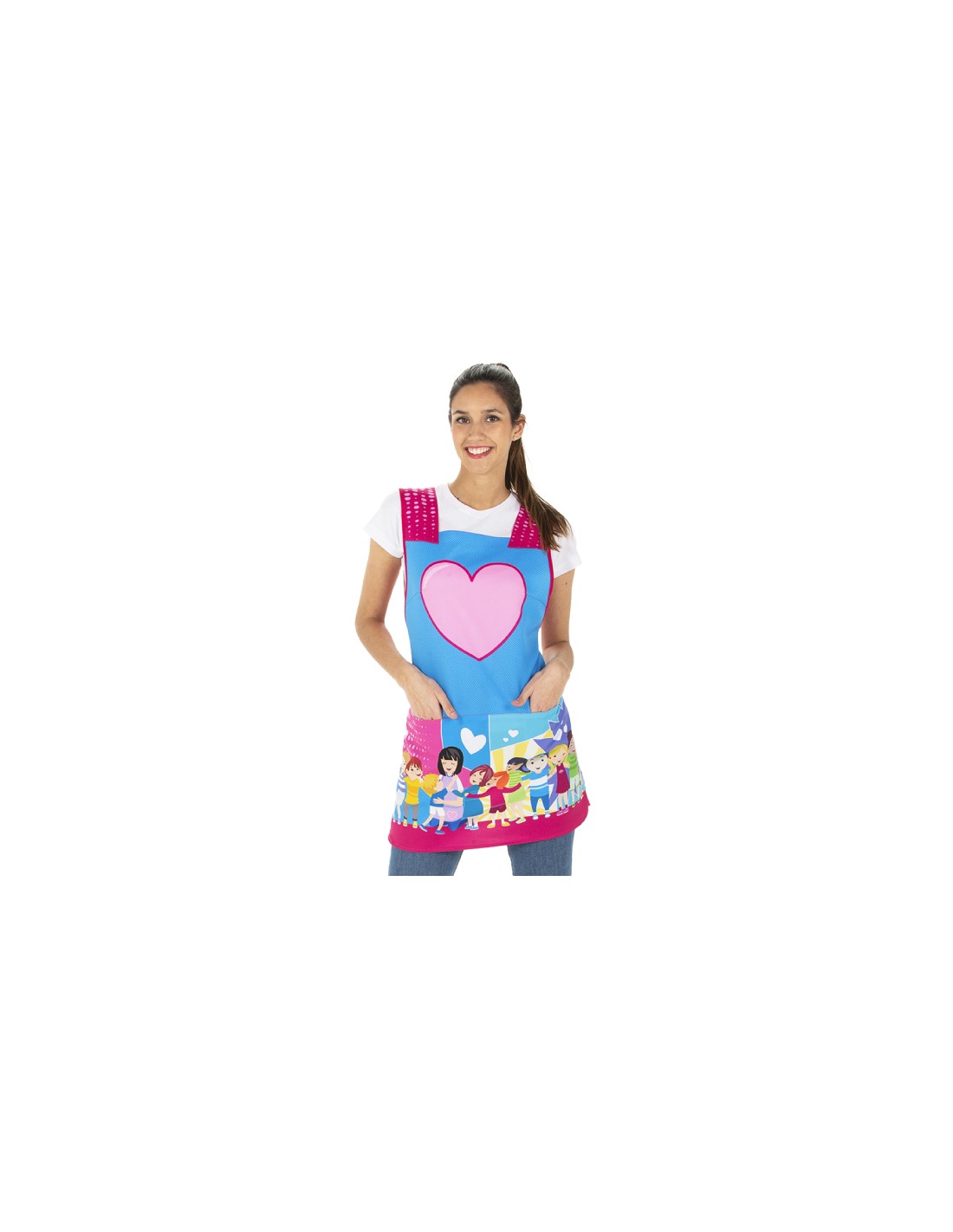 Simpatico grembiule per insegnante fucsia e blu combinato con stampa di disegni di bambini e cuore sulla pettorina. Due tasche frontali- Il cuore ha spazio per la personalizzazione (se vuoi). Multi taglia regolabile con nastri (da XS a XL).