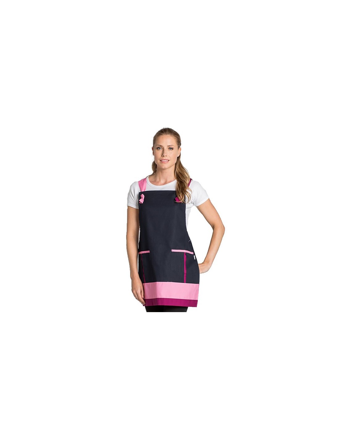 Grembiule texano con dettagli di colore rosa e fucsia. Fattorini nei laterali. Multitalla regolabile, della XS alla XL. Modello adatto per commercio in generale come vestiario per uso di diario.