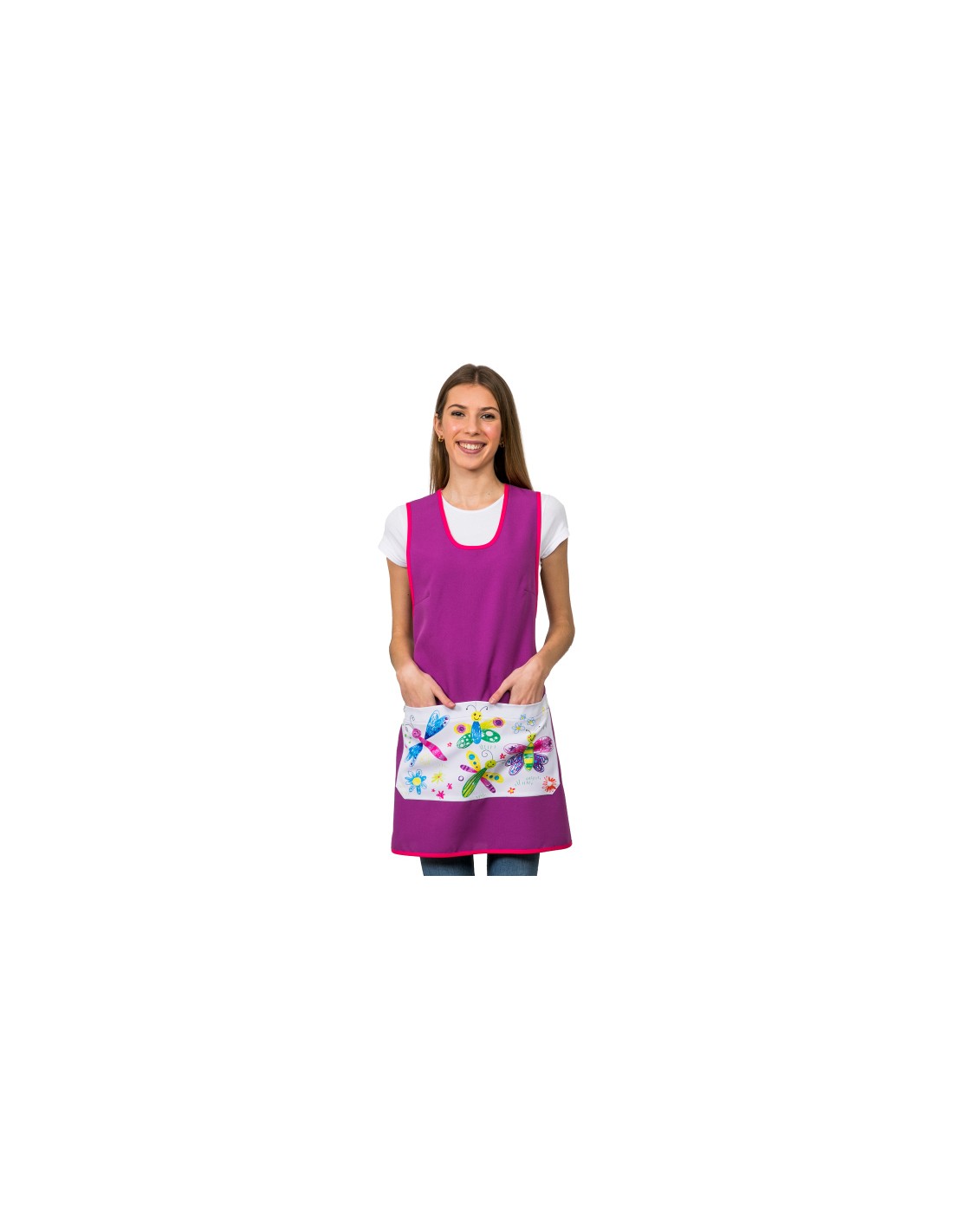 Divertente grembiule da insegnante in viola e vivo fucsia abbinato a una colorata stampa di farfalle sulla tasca frontale divisoria. Multi taglia regolabile con nastri. Disponibile in taglia Standard (S) e Maxi (L). Puoi vedere le misure nella foto. Tessuto morbido e piacevole al tatto.