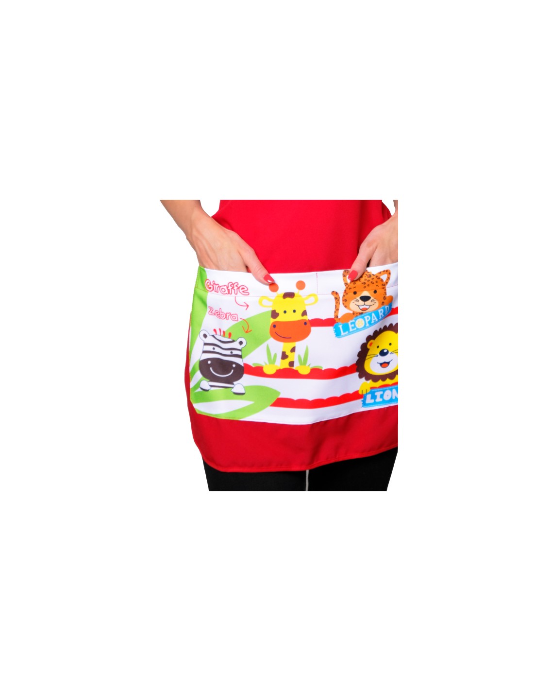 Grembiule da insegnante in rosso con una divertente stampa animalier nella zona della grande tasca divisoria anteriore. Multi-taglia regolabile con cinghie (dalla XS alla XL). Tessuto traspirante e antibatterico, tollera gli schizzi di candeggina, asciuga rapidamente e non necessita di stiratura.