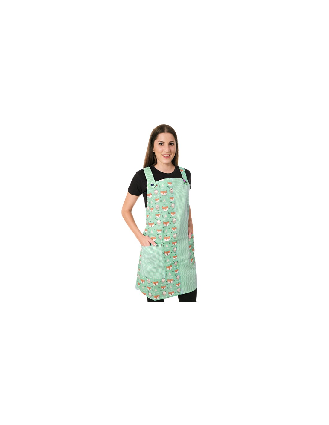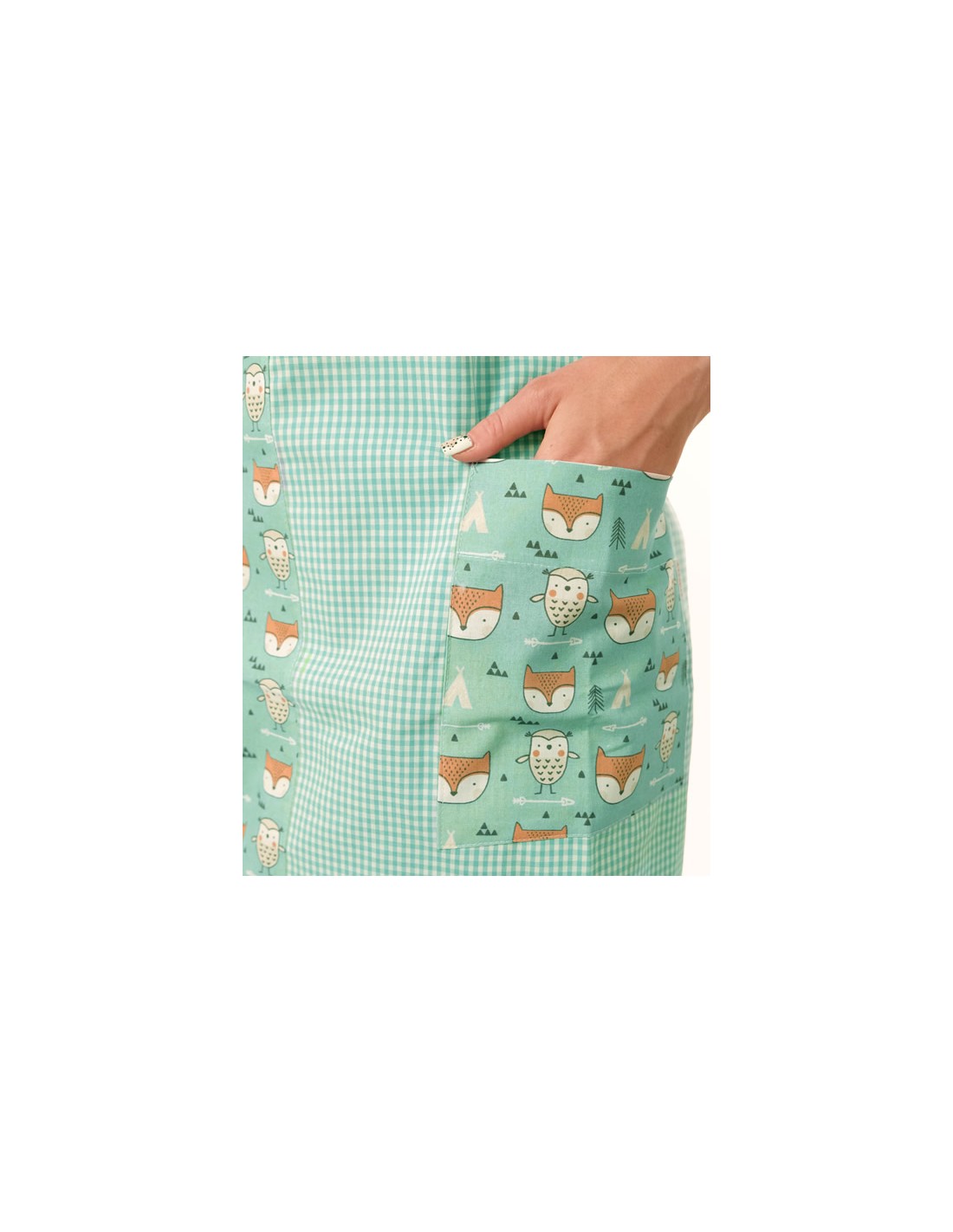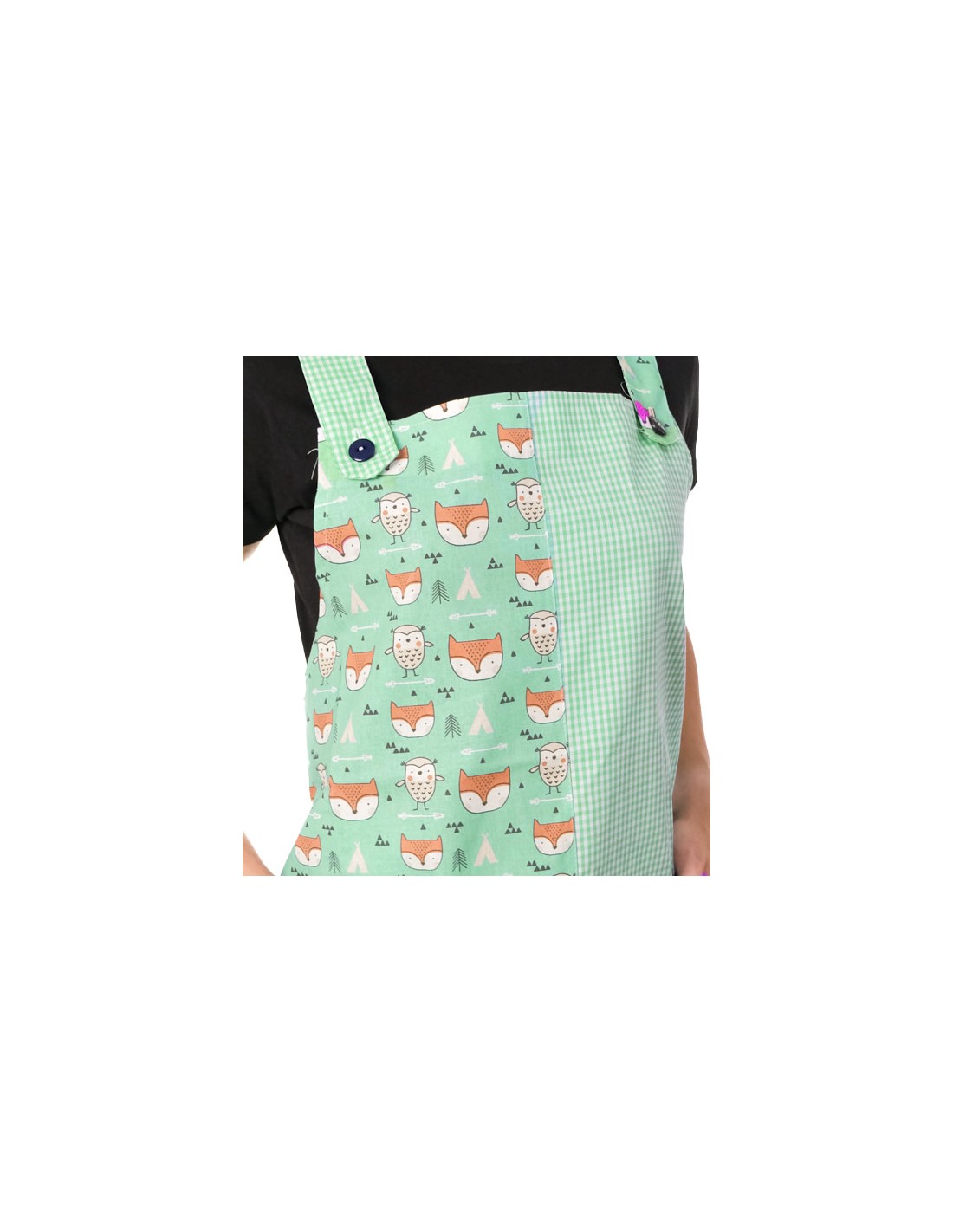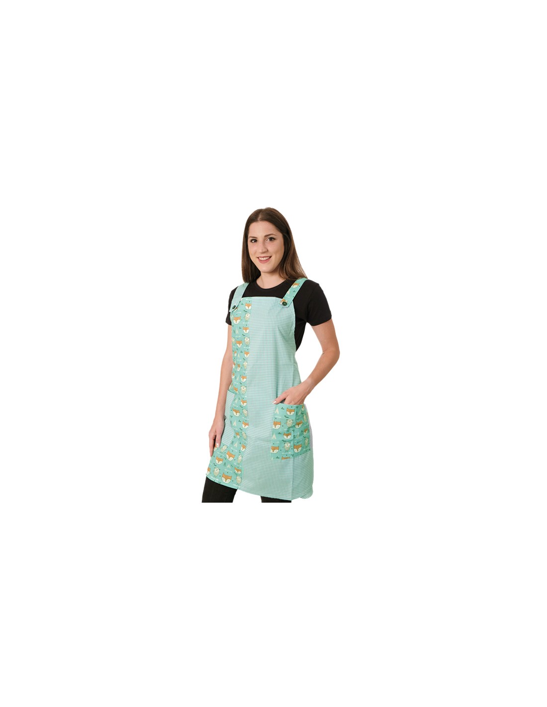 Grembiule insegnante realizzato in tessuto vichy turchese abbinato a stampa gufi e volpi sul davanti destro. Spalline incrociate sul retro e due grandi tasche coordinate sulla stampa. Taglia unica, multitaglia regolabile con fettucce dalla taglia XS alla XXL