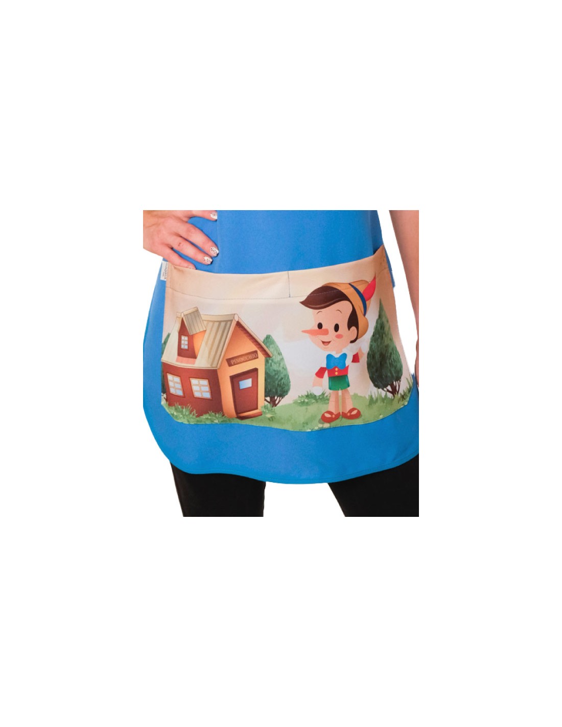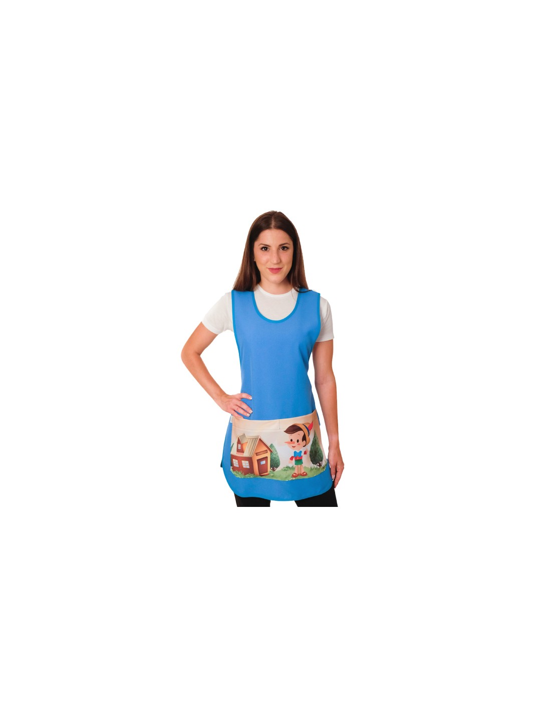 Grembiule unico ed esclusivo per l'insegnante blu con stampa tascabile di un bambino in legno sul paesaggio. Girocollo. Ampia tasca frontale divisoria centrale. Realizzato con tessuto 100% POLIESTERE traspirante. Taglia unica. Multi-taglia. Regolabile con nastri dalla taglia XS alla taglia XXL