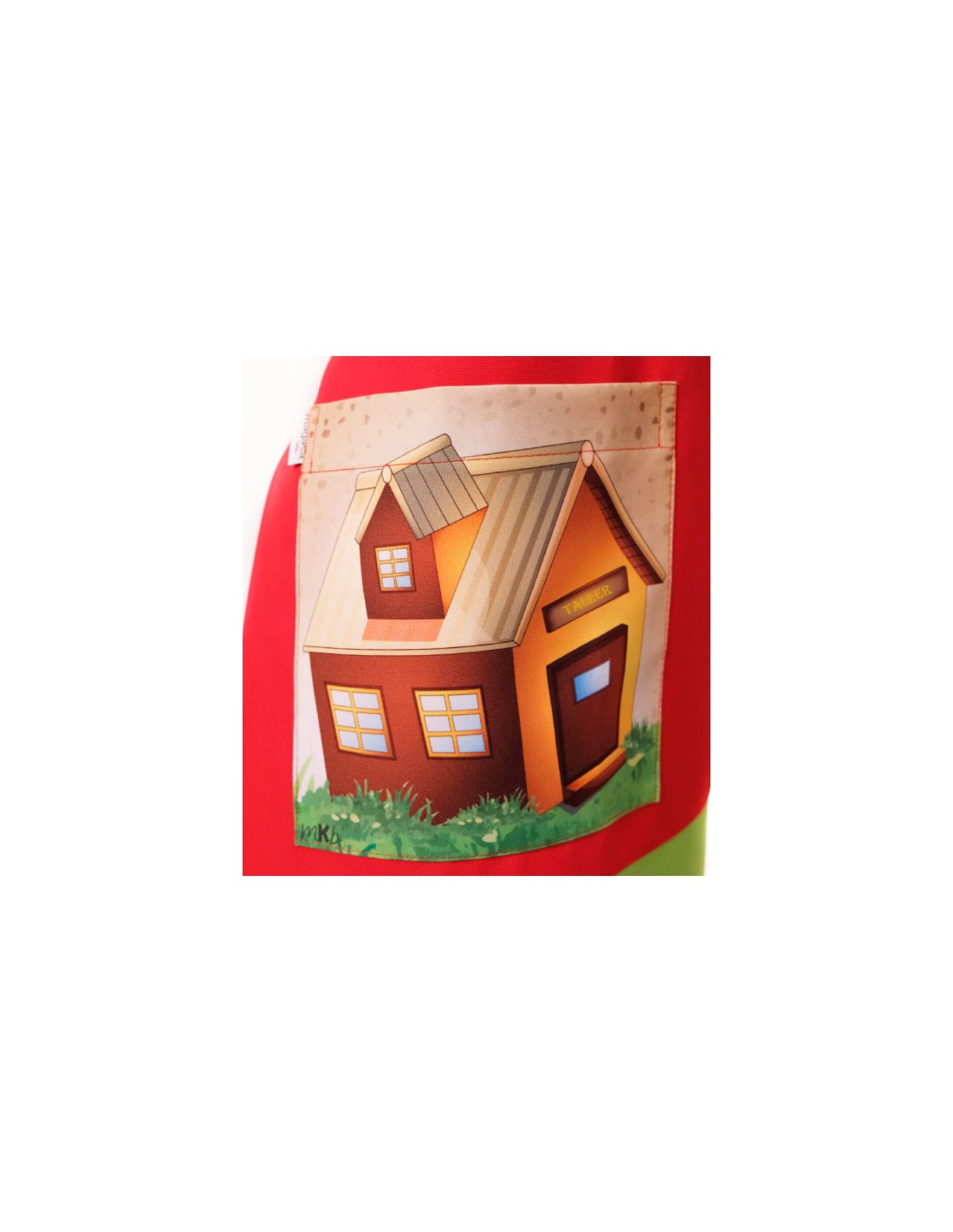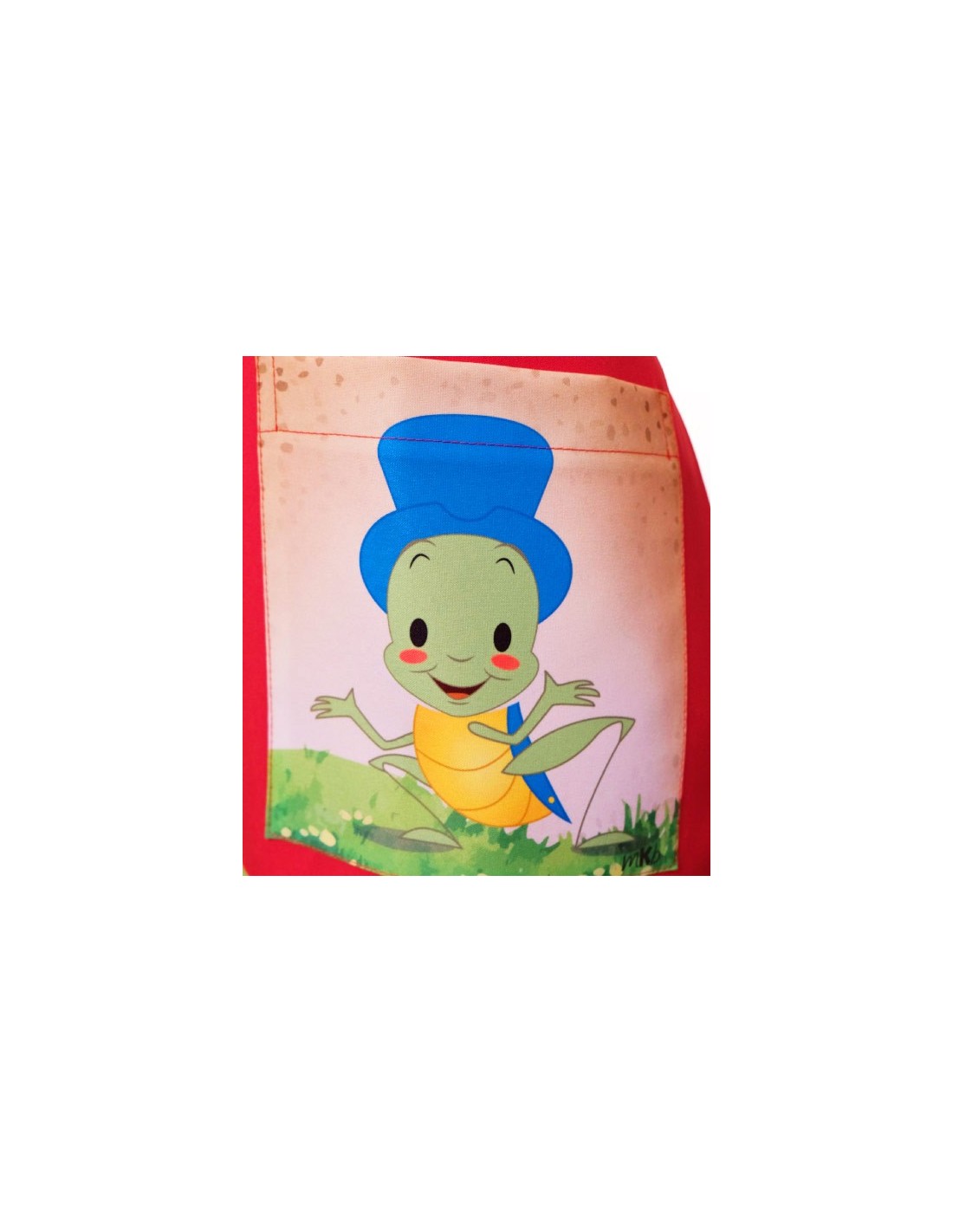 Non dimenticare di salvare la tua personalizzazione per poter riempire il carrelloGrembiule rosso unico ed esclusivo per l'insegnante con stampa del petto di un bambino in legno sul paesaggio. Due tasche frontali, quella destra con motivo di officina in legno e quella sinistra con un simpatico grillo.