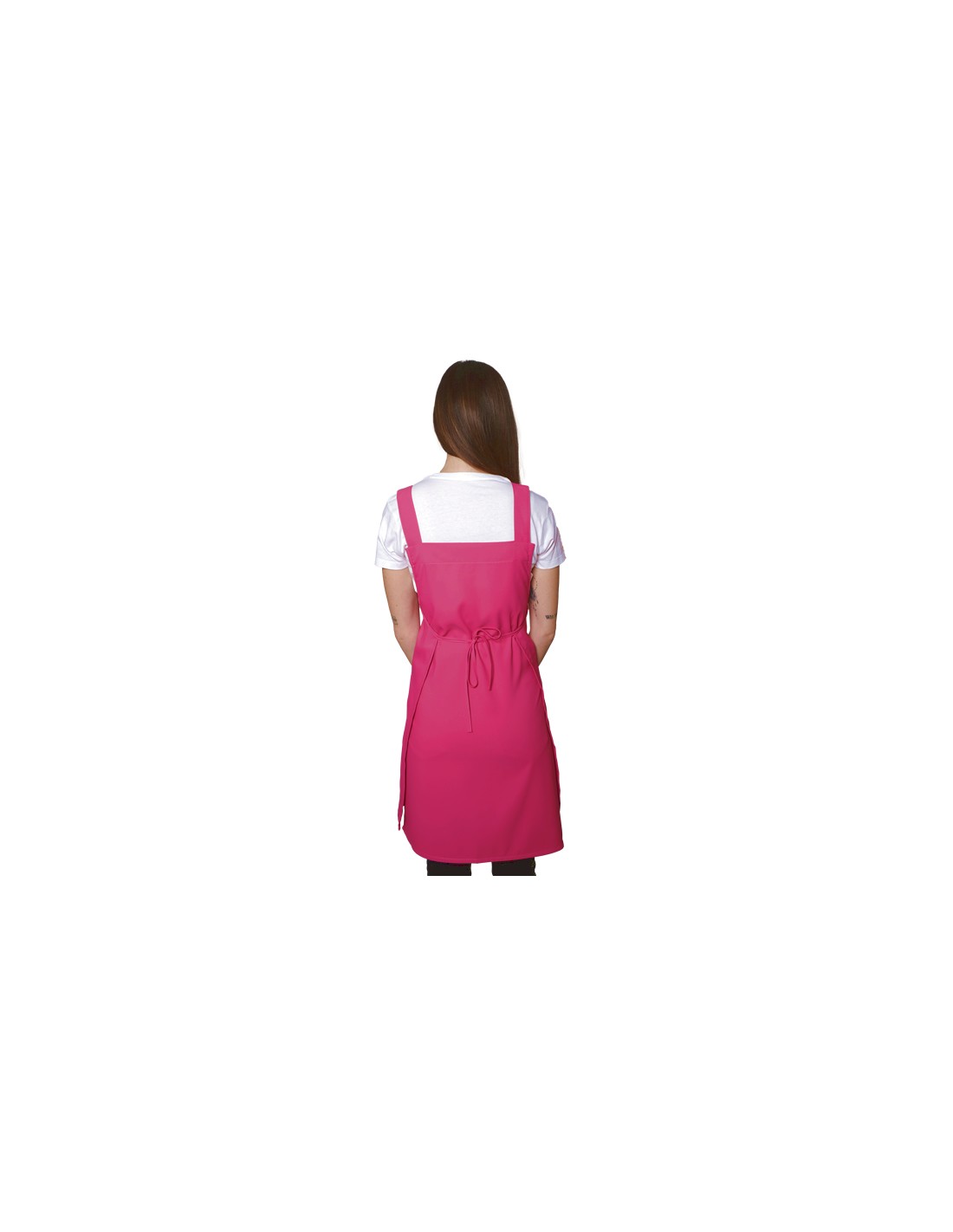 Grembiule fucsia per insegnante con stampa fiori colorati sulle tasche. Una grande tasca centrale frontale e una più piccola sul petto per la penna. Spalline regolabili con bottone decorativo e occhiello in metallo