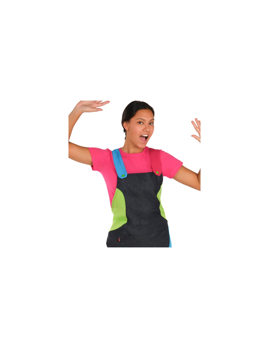 Grembiule da insegnante in denim con applicazioni multicolori. Presenta cinturini colorati (uno fucsia, uno blu), una tasca centrale e applicazioni laterali. Taglia unica (dalla XS alla XXL). Regolabile con lacci.