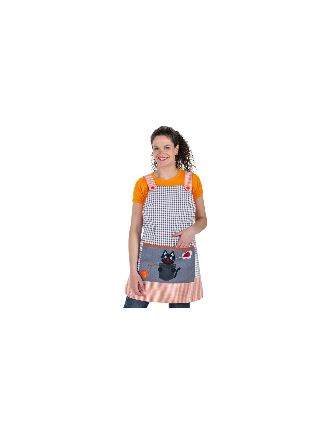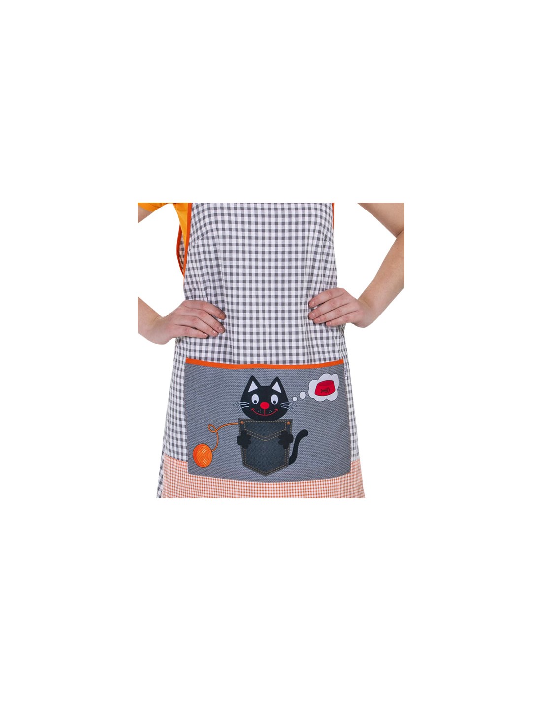 Non dimenticare di salvare la tua personalizzazione per poter riempire il carrelloGrembiule da insegnante a quadri grigio con divertente stampa sulla tasca di un gatto nero. Bretelle e bies arancioni a contrasto. Si adatta e si adatta al corpo tramite nastri. Lunghezza 85 cm.