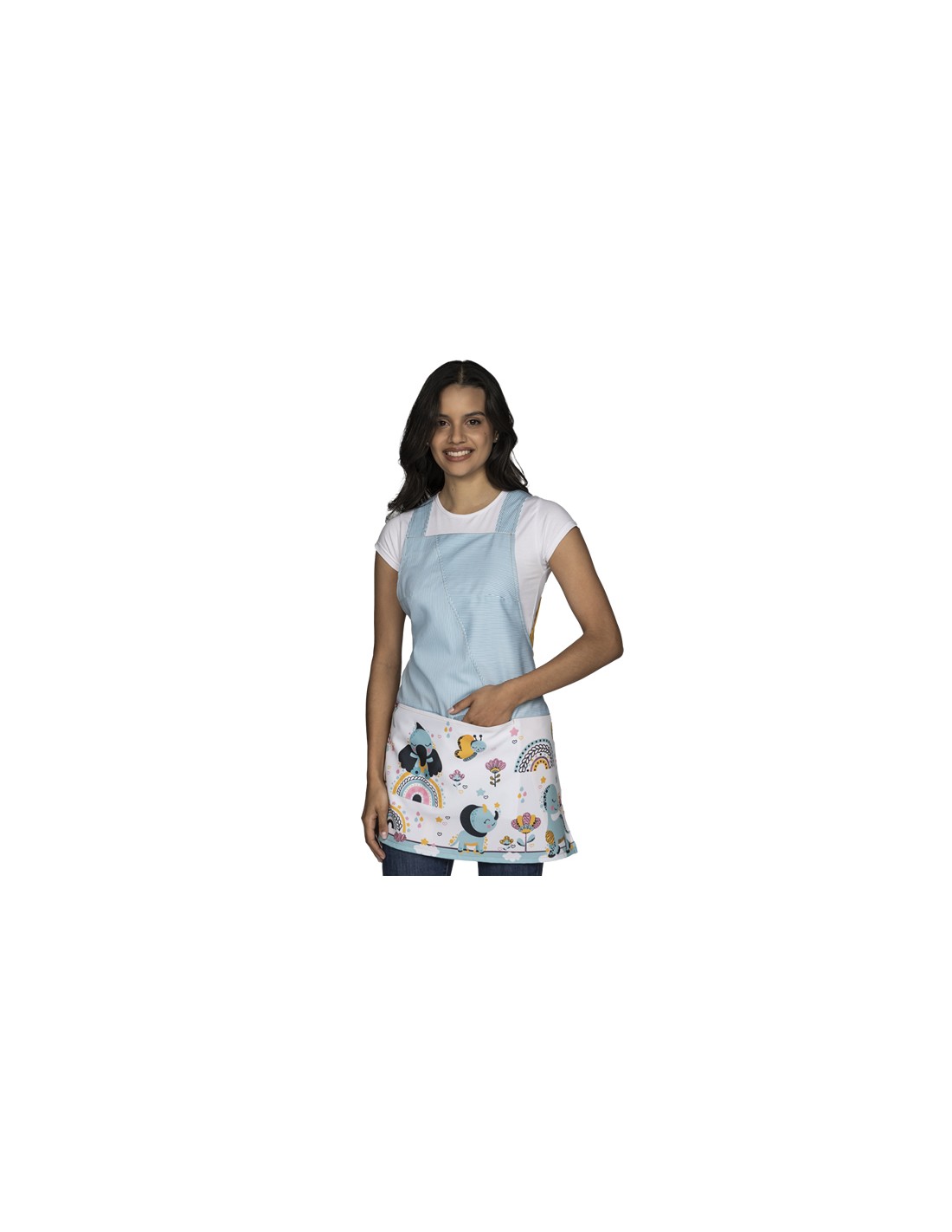 Grembiule per insegnanti realizzato in tessuto a righe azzurre, intrecciate orizzontalmente e verticalmente nella zona del bavaglino, con una divertente stampa azzurra di animali fantastici nella parte inferiore e una grande tasca interna. Abbinare il retro con tessuto giallo senape. Collo a scatola accompagnato da spalline a righe, pinces sul petto e sulla schiena per una maggiore vestibilità e comfort. Taglia unica con spalline e adattabile al corpo dalla taglia XS alla 2XL.