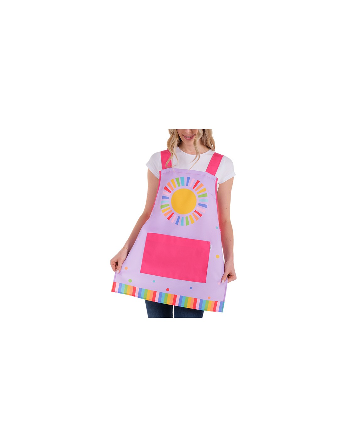 Divertente grembiule lilla per insegnanti con stampa a forma di sole colorato sul davanti, retro fucsia coordinato con le spalline e tasca centrale anteriore. Pinces sul petto e sulla schiena per una maggiore adattabilità e una vestibilità aderente. Taglia unica, regolabile con bottoni laterali a 3 vie, dalla XS alla XXL. Lunghezza circa 83 cm. Tessuto 100% poliestere.