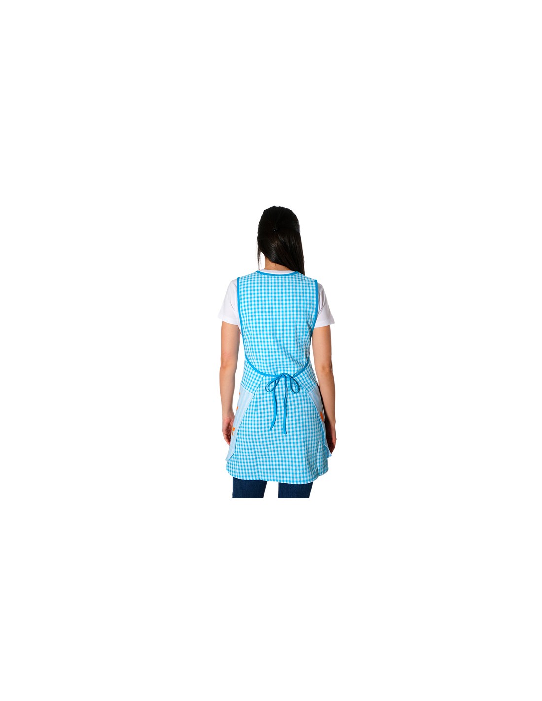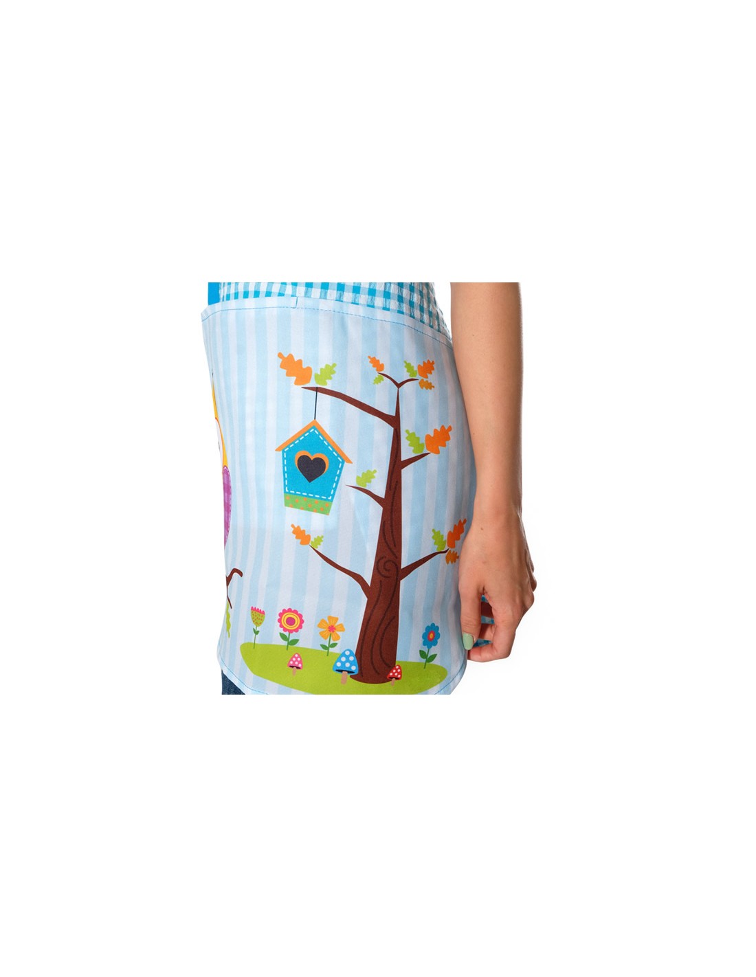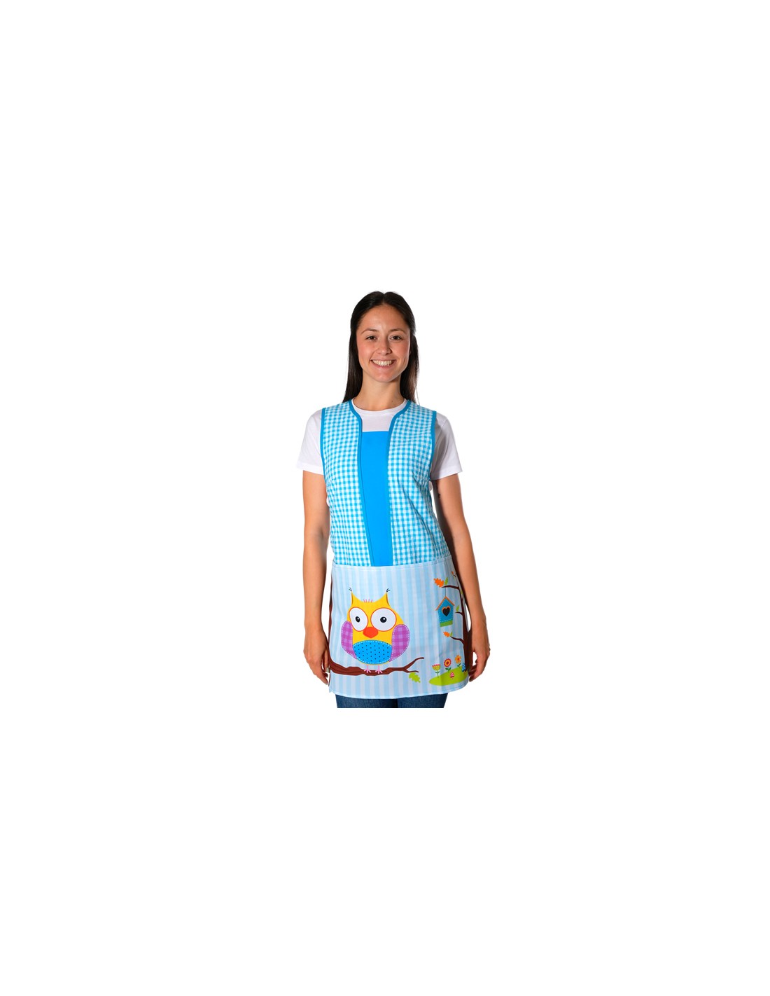 Grembiule da insegnante con una divertente stampa a forma di gufo, realizzato in tessuto Vichy Bambula blu, 65% cotone e 35% poliestere. Il tessuto di alta qualità è piacevole al tatto, resistente e facile da lavare e asciugare. Combina quadri bianchi e blu. La tasca centrale all'altezza dei fianchi presenta una divertente stampa di un gufo appollaiato su un ramo. Taglia unica, regolabile con lacci, e veste dalla XS alla XXL. Accattivante e divertente.