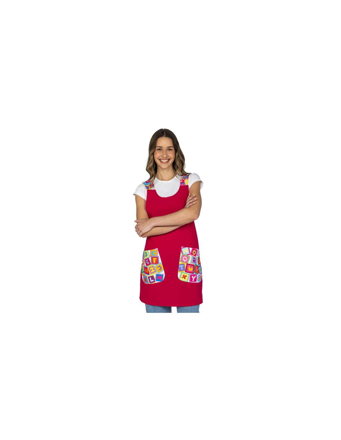 Grembiule da insegnante fucsia con schiena incrociata e scollo rotondo. Presenta due tasche e pinces anteriori. Un tocco unico sono le spalline e le tasche con stampa a forma di zuppa di lettere dell' alfabeto. Realizzato in 100% poliestere. Disponibile nelle taglie M o XL. Lunghezza circa: 84 cm.