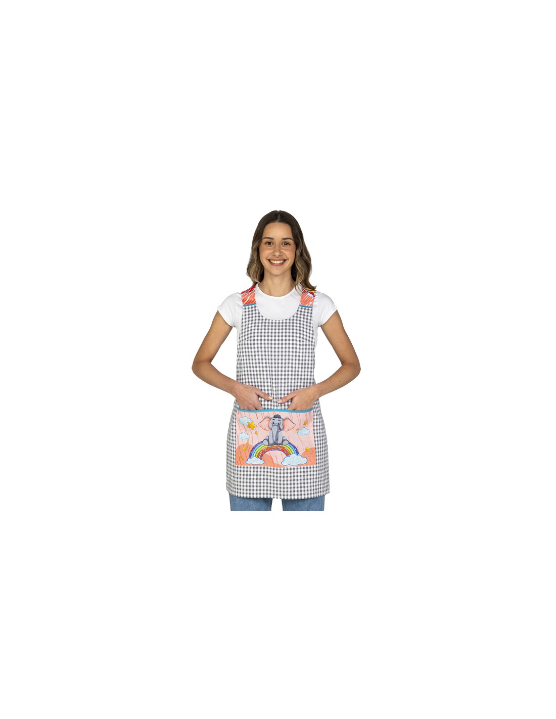 Grembiule da insegnante in tessuto a quadretti grigi con tasca centrale decorata con una stampa di elefanti su sfondo arcobaleno con nuvole e stelle color corallo. Spalline con la stessa stampa color corallo. Design con incrocio sulla schiena per maggiore comfort e libertà di movimento. Include pinces sul busto per una migliore vestibilità. Disponibile nelle taglie M e XL. Composizione: 65% cotone e 35% poliestere. Lunghezza approssimativa: 84 cm.