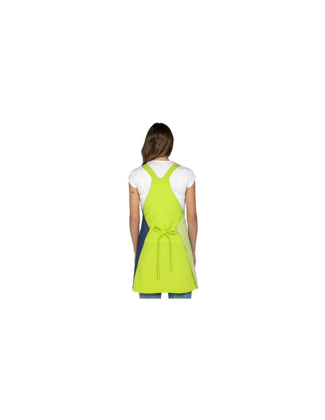 Grembiule da insegnante in tessuto a quadretti pistacchio e denim blu navy. Presenta un'ampia tasca frontale stampata con divertenti illustrazioni di animali e messaggi. Regolabile con lacci, questo grembiule multi-taglia veste dalla XS alla XXL. Composizione: 67% poliestere, 33% cotone. Lunghezza: 84 cm.