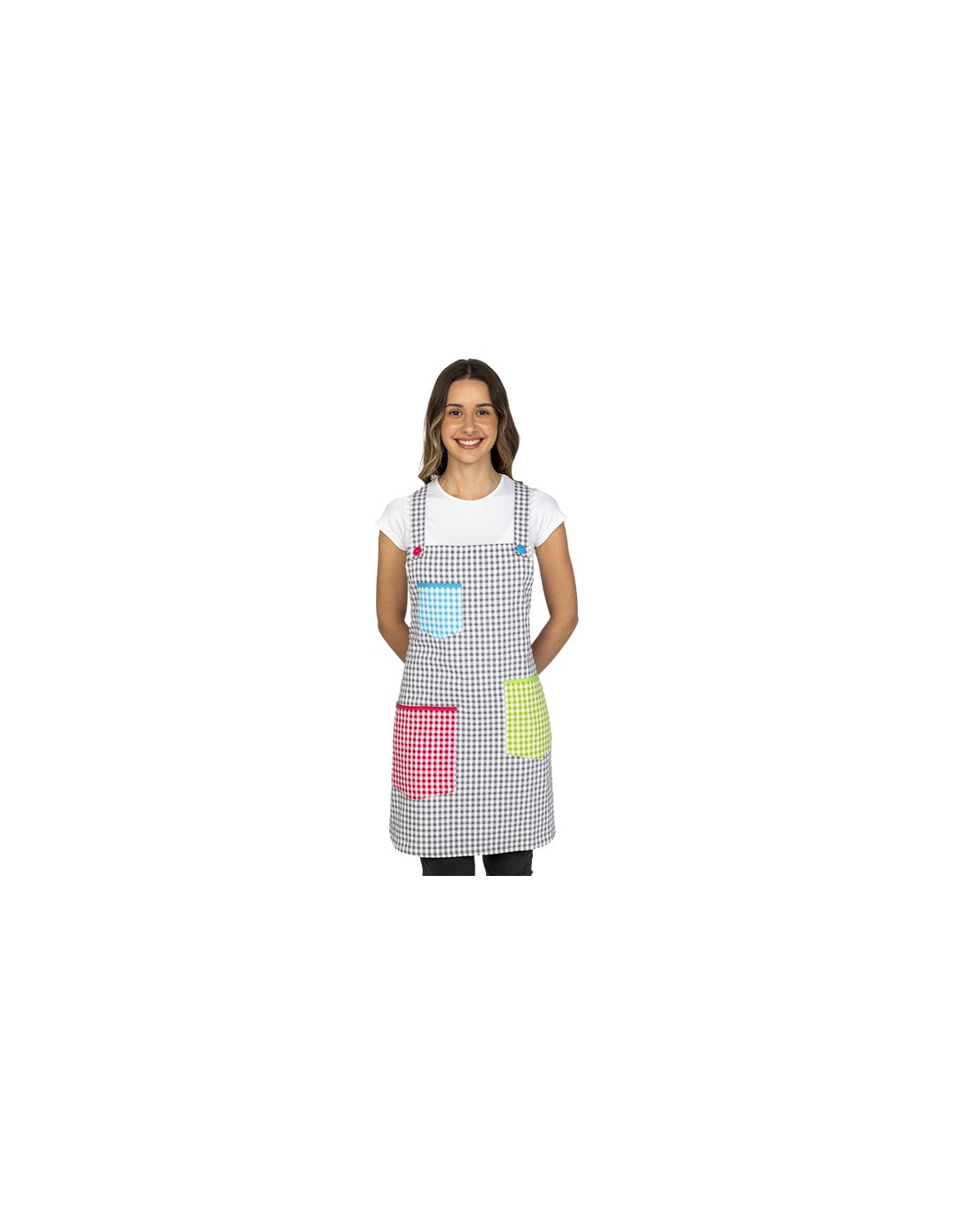Grembiule da insegnante in tessuto a quadretti grigi con tre tasche nei colori fucsia, pistacchio e turchese, anch'esse a quadretti. Dotato di bretelle e lacci regolabili sul retro per una vestibilità comoda. Taglia unica, lunghezza 84 cm.