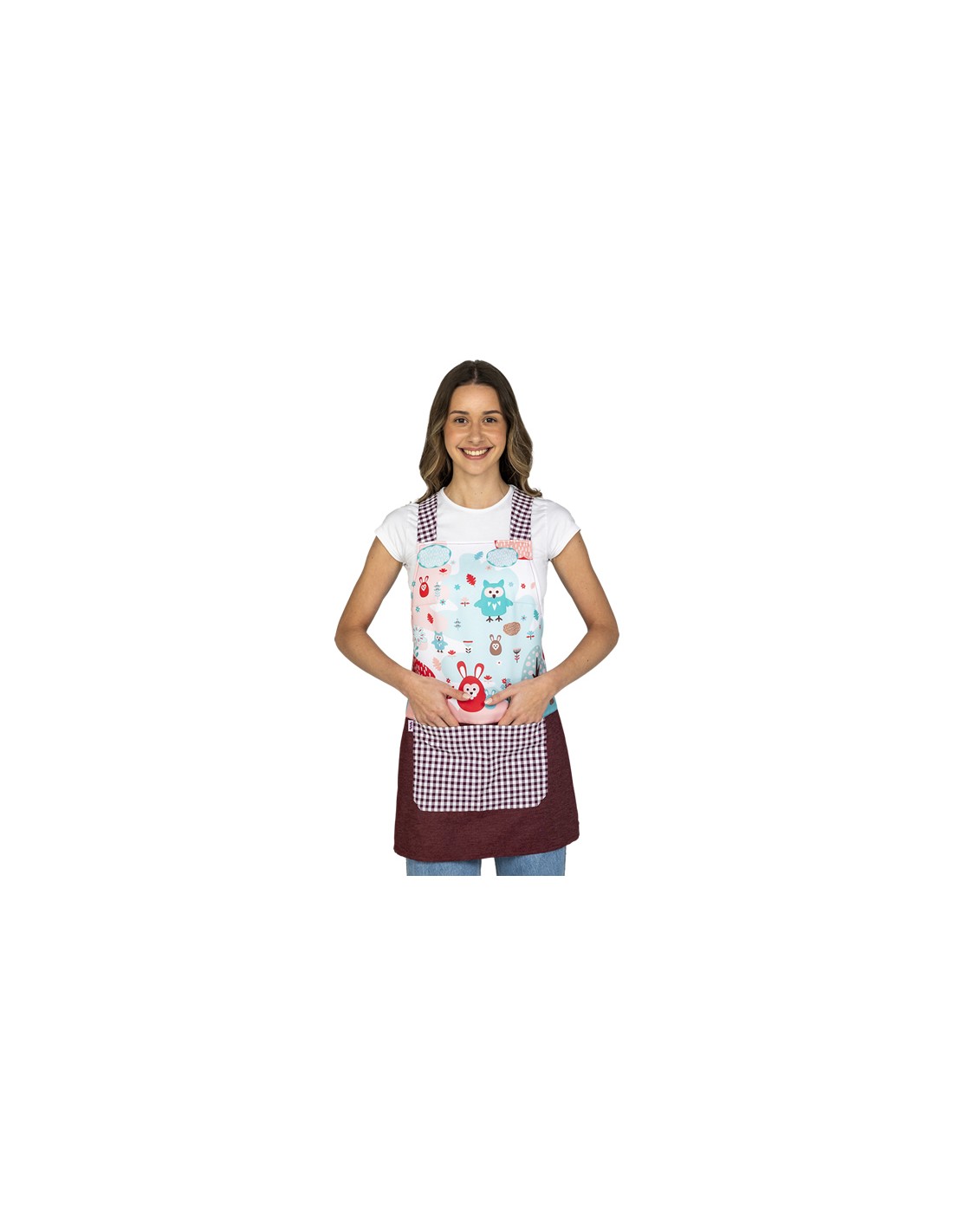 Grembiule in denim elasticizzato color bordeaux con laccetti e tasca a quadretti con stampa di animali del bosco. Il modello multi-taglia è regolabile tramite coulisse per adattarsi alle taglie dalla XS alla XXL. Realizzato in tessuto ricco di cotone con una leggera elasticità. Lunghezza: 84 cm.